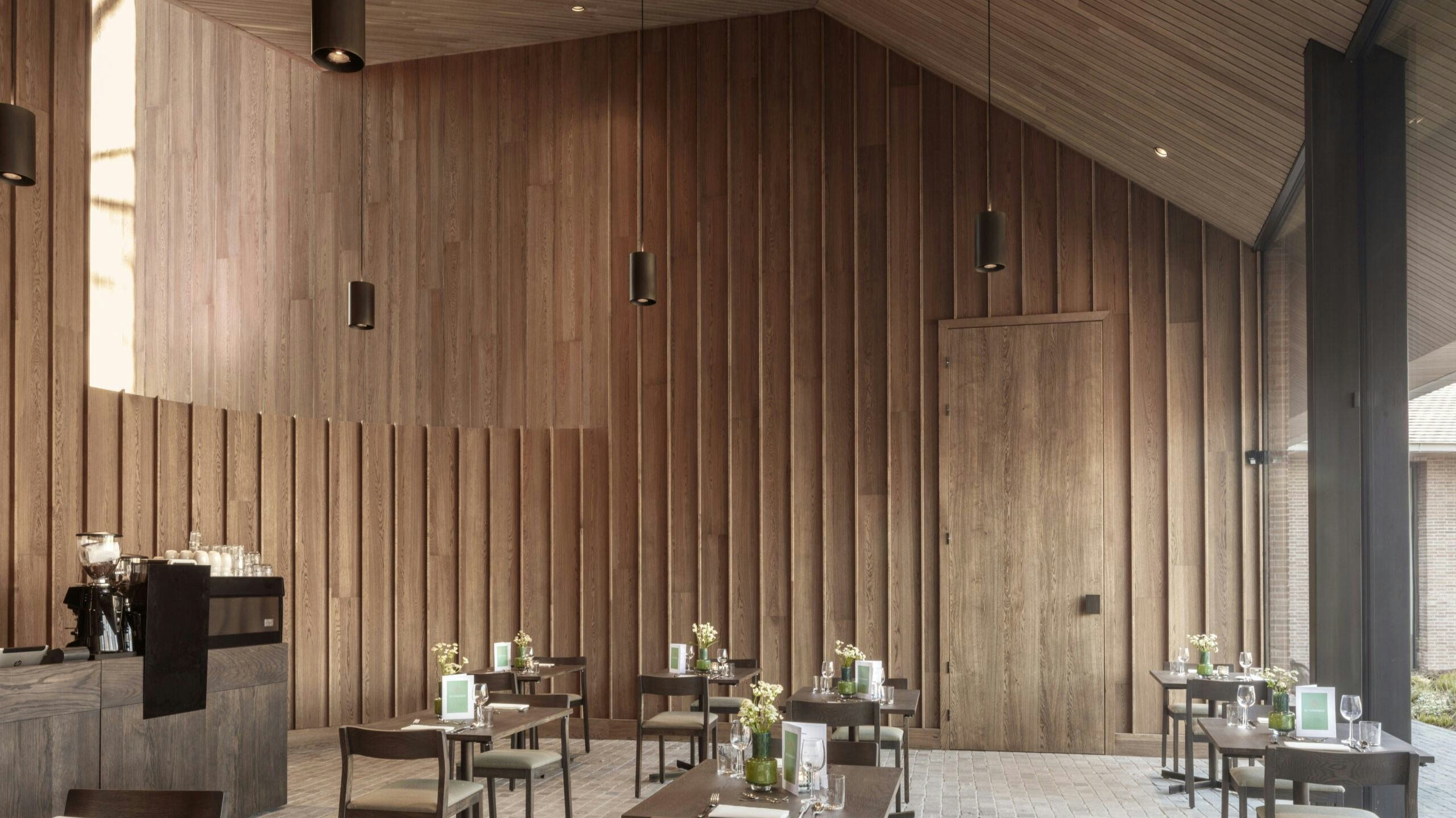 In het museuminterieur laten we elementen uit de oude villa in een geabstraheerde vorm terugkeren, zoals de eikenhouten lambrisering in de tuinkamer en de eveneens eikenhouten omlijstingen van de doorgangen. Samen met de plinten en de doorlopende eiken parketvloer vormen ze een constante in zowel de gerenoveerde als de nieuwe zalen. Met onze opdrachtgever en bouwers deelden we de overtuiging dat we samen werkten aan iets bijzonders waarbij het ambacht van het maken weer opnieuw centraal stond.