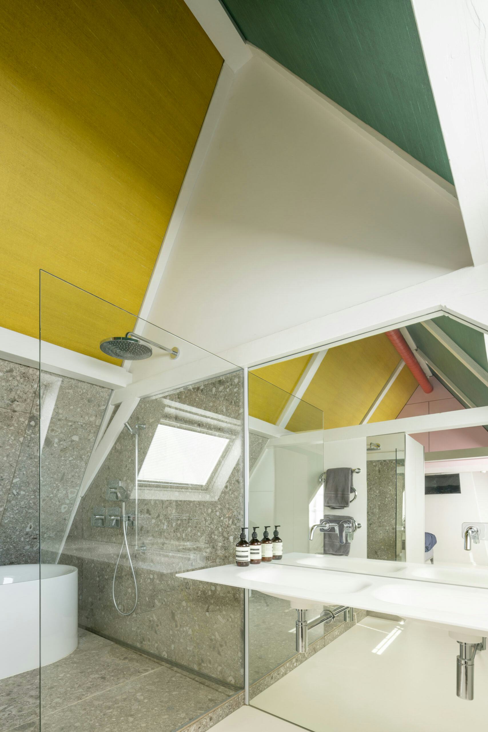 Uiteenlopende ambachtelijke en innovatieve technieken en materialen zijn gebruikt. Naast elkaar vindt men originele houten wanden, kozijnen, vloeren en trappen en nieuwe rvs en houten wanden, stalen kozijnen, terrazzo-, houten- en gietvloeren, glazen balustrades, kleurfolies en polyester bekledingen. Het kleurpalet is gebruikt als verbinding en versterking.