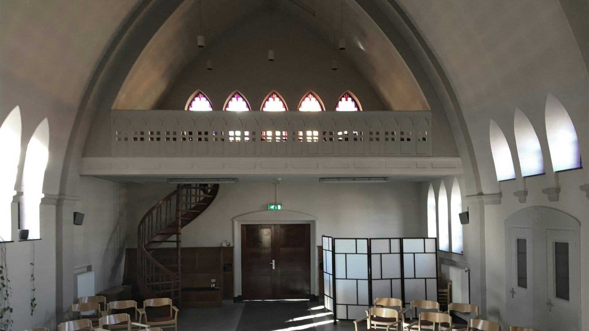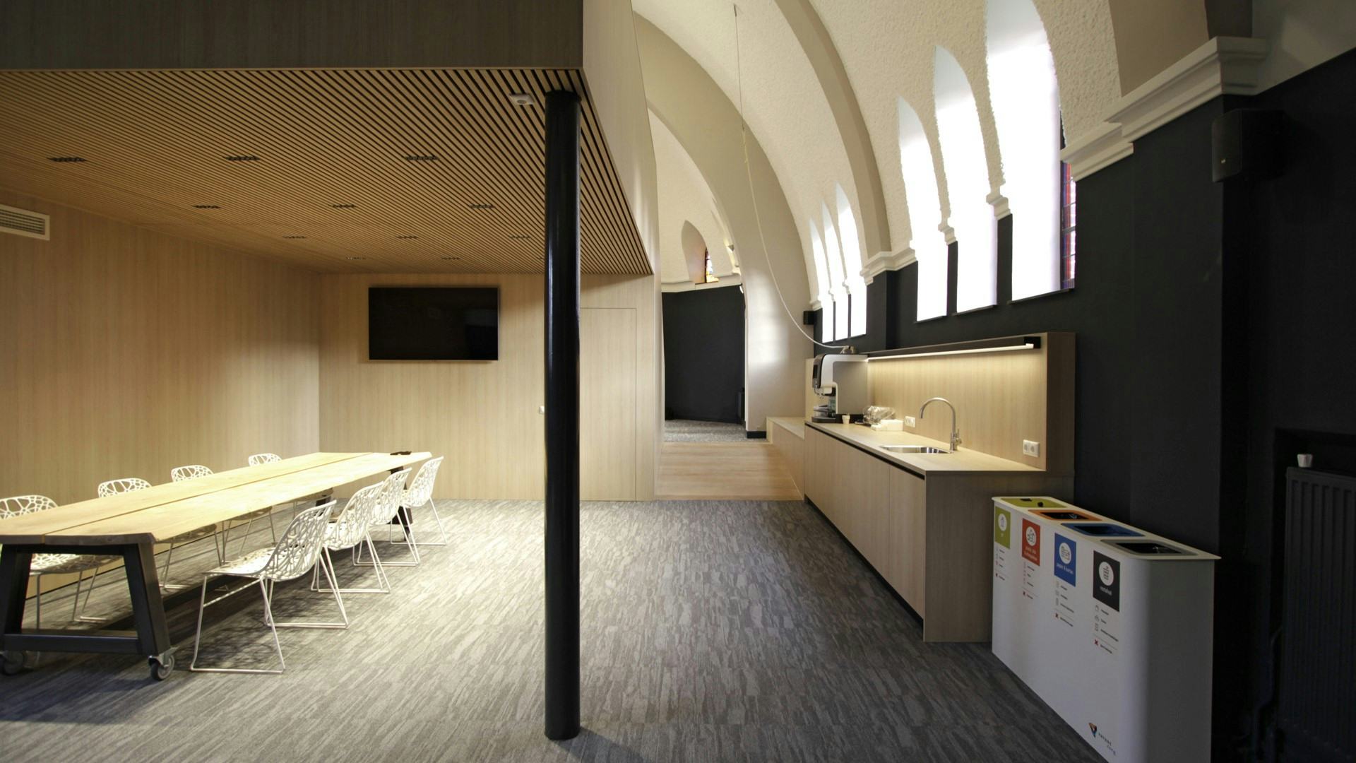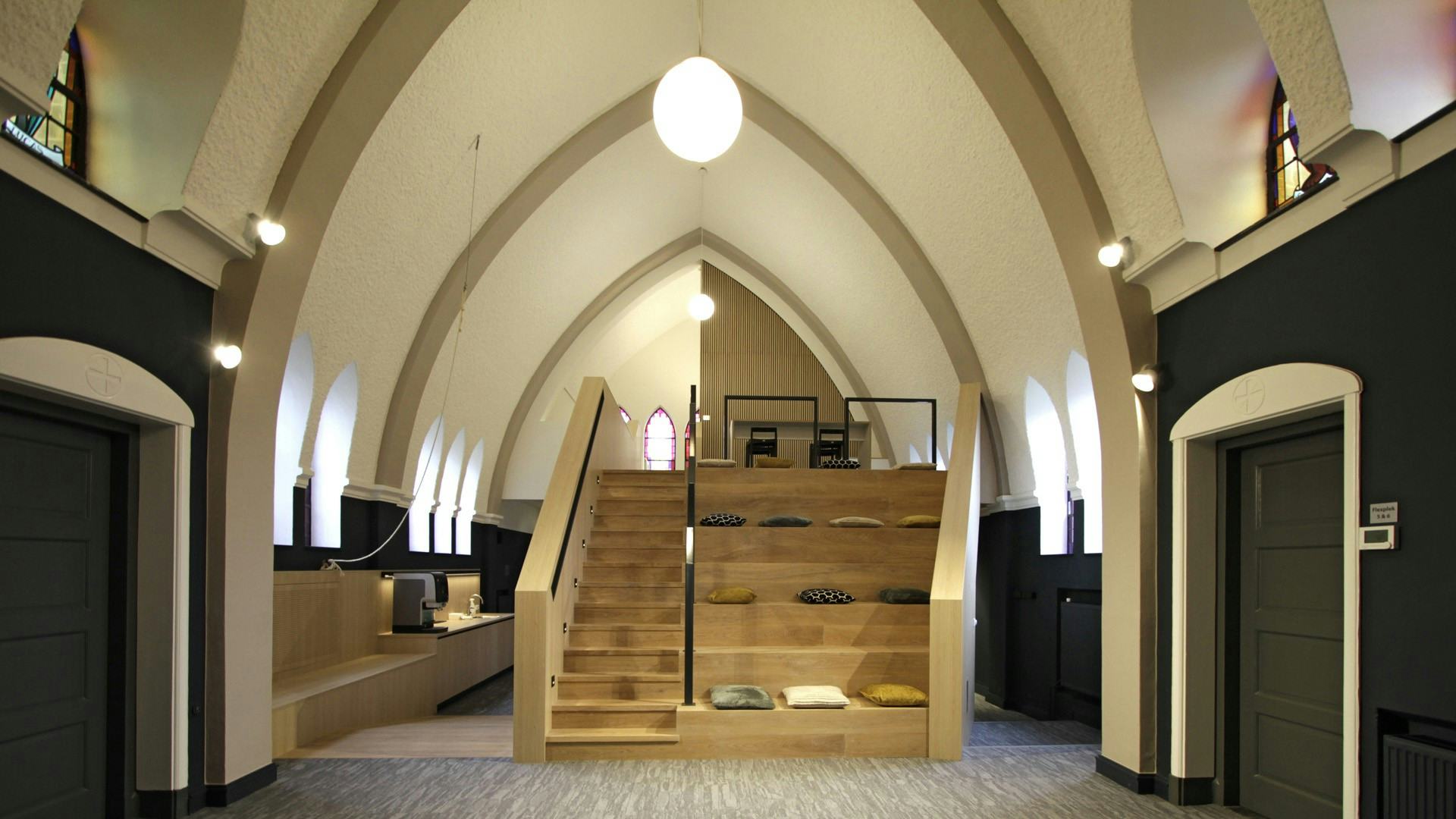 Door toevoeging van een sculpturaal element met een eenduidige uitstaling geeft dit rust in de ruimtelijke sfeer van de kapel. Bekleding van het sculptuur is gemaakt met HPL-wandbekleding.