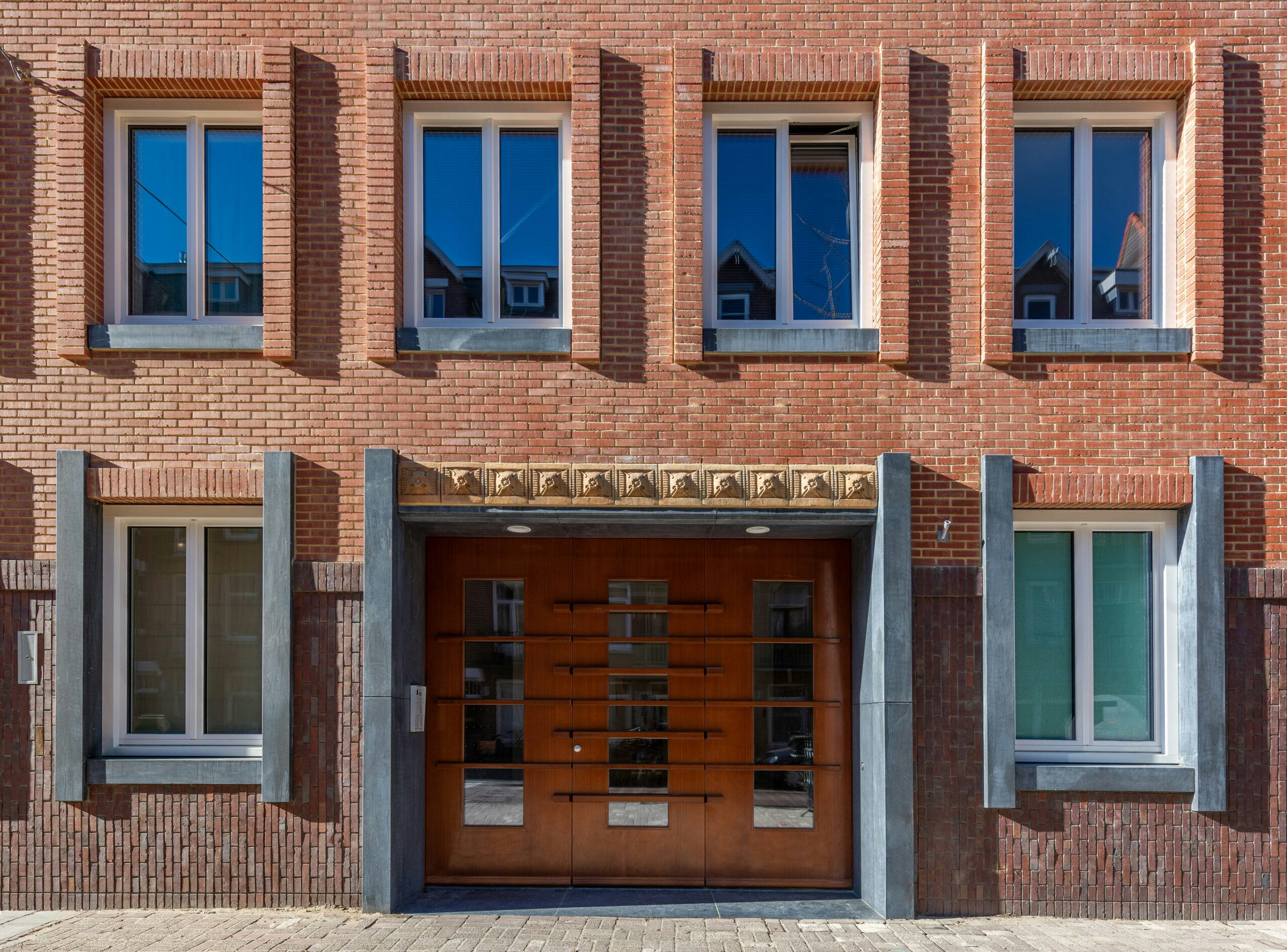 Als materiaal was het uitgangspunt om aan te sluiten bij de materialisering van het naastliggend blok van De Klerk. Dat betekent metselwerk, in deze tijd is het technisch en economisch niet meer mogelijk om te detailleren zoals in de tijd van de Amsterdamse School. Echter door gebruik te maken van prefab metselwerk is er toch een vergelijkbare ornamentiek ontworpen geïnspireerd op de Amsterdamse School. Daarnaast zijn de houten entreedeuren extra hoog en voorzien van ornamenten.