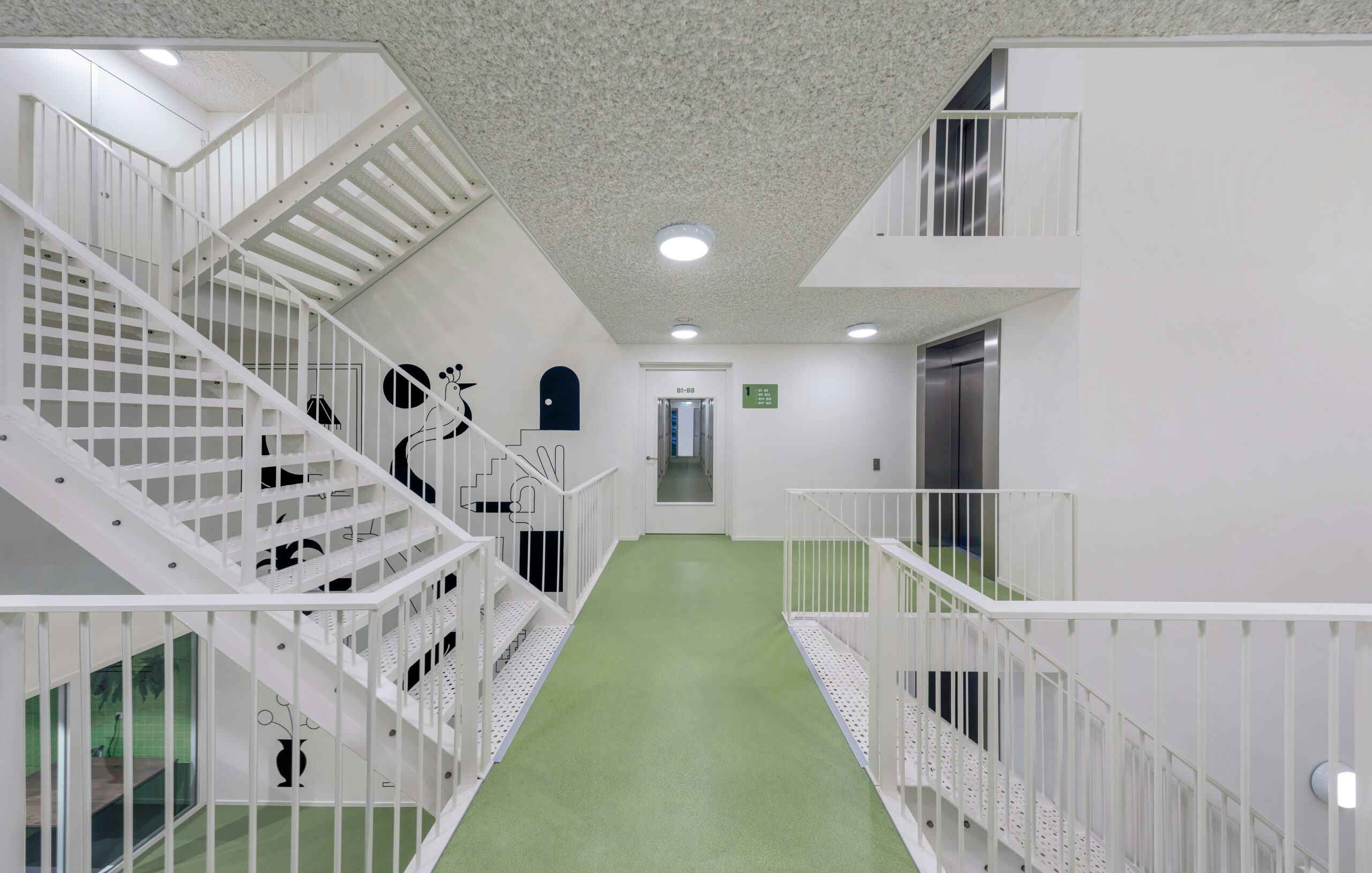 Op de begane grond en in het hoofdtrappenhuis is er veel ruimte gemaakt voor gezamenlijke activiteiten. Het trappenhuis heeft een spectaculair Piranesi-achtig ontwerp, met trappen en bruggen die elkaar passeren, om de kans op spontane ontmoetingen te vergroten. Op de begane grond biedt een ruimte hal toegang tot de gemeenschappelijke woonkamer en een tuin met een kas waar bewoners hun eigen eten kunnen kweken. Alle gemeenschappelijke ruimtes zijn ontworpen om collectief gebruik te stimuleren.