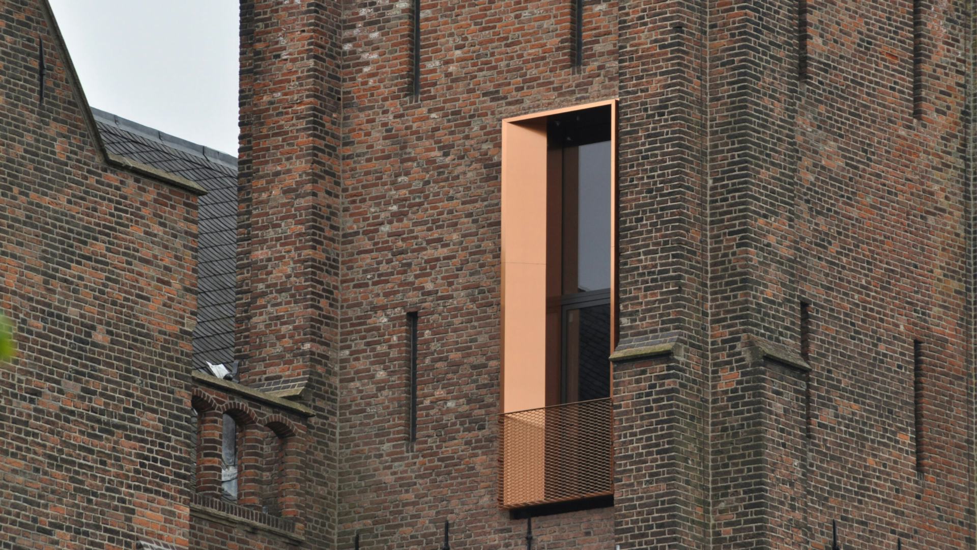 De originele spleten sluiten eigenwijs aan op de nieuwe ramen; ze overlappen elkaar. Je voegt iets toe uit deze tijd, als een sieraad. Het is afleesbaar wat er later aan toegevoegd is, zonder het oude te vervagen, kopiëren of vervangen. Door de zwarte terugliggende rand om het kozijn lijken de kozijnen te zweven in de gevel. De oude gevel maakt ruimte voor het nieuwe. Een ogenschijnlijk klein detail maar enorm belangrijk voor het beeld. Er is letterlijk geen botsing tussen oud en nieuw, maar het geheel werkt mooi samen in kleur en detaillering.