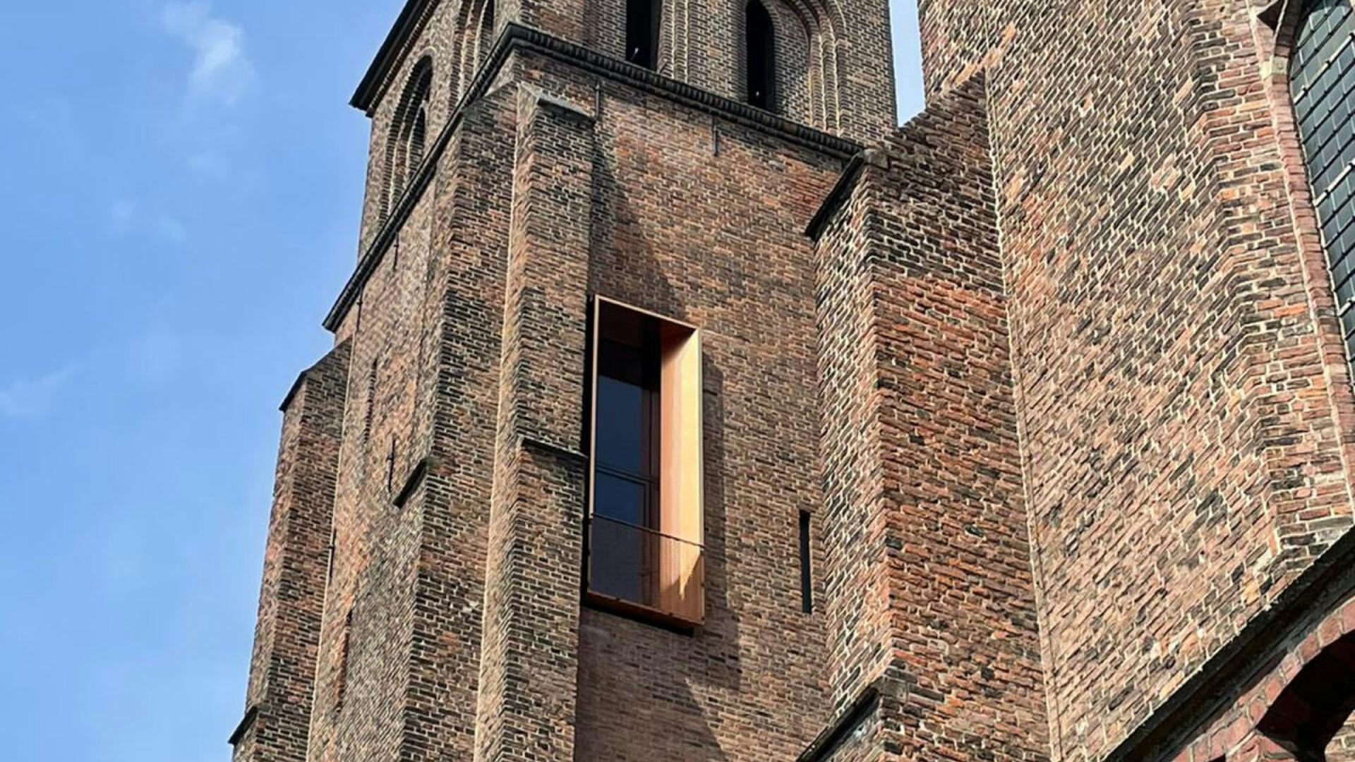 Toen Atelier Blik begon met schetsen zei iedereen dat dit nooit ging lukken: Oud roze wandafwerking tot aan de gewelven in het middenschip en 4,5m hoge koperen kozijnen in de torens van de oudste kerk van Arnhem. Op papier inderdaad heel gewaagd, maar in de werkelijkheid mooi in balans.