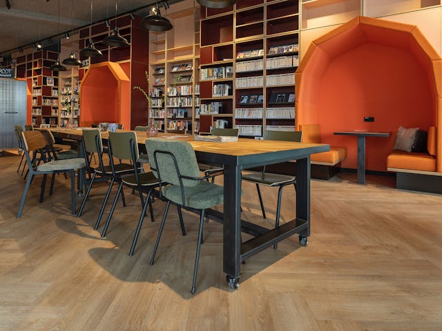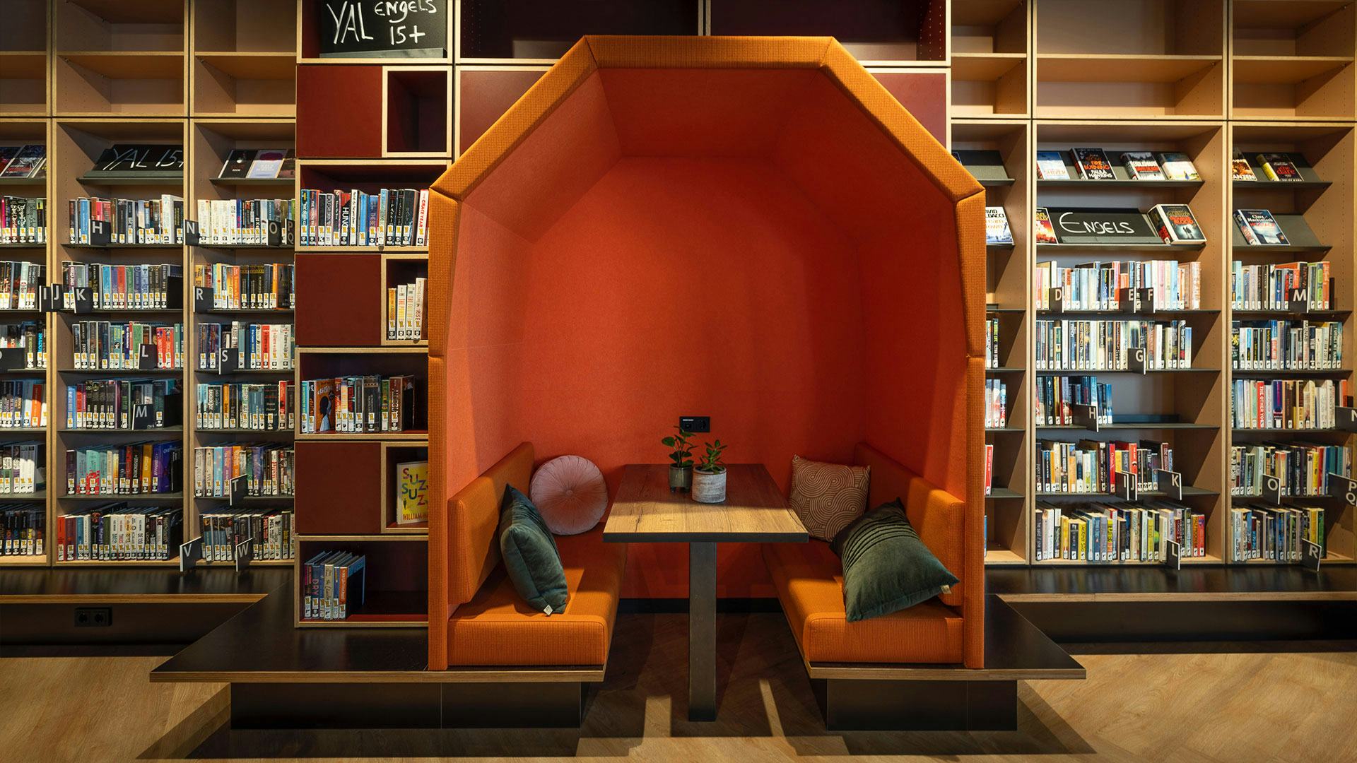 accentueren, omarmt een XXL boekenkast als het ware een lange wand waarin ook de knusse oranje huisvormige cocoons verwerkt zijn. De talloze boeken vormen door de gehele ruimte min of meer het interieurdecor. Verder is er een werkbar met uitzicht