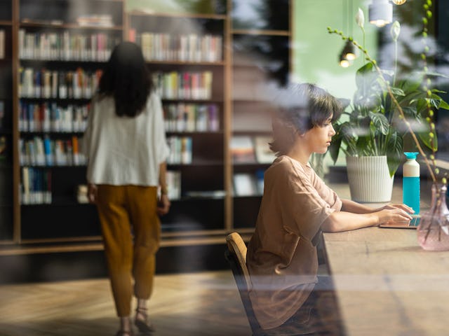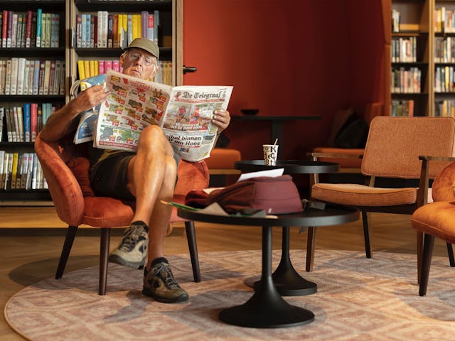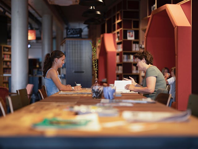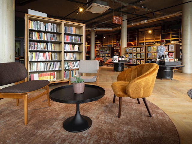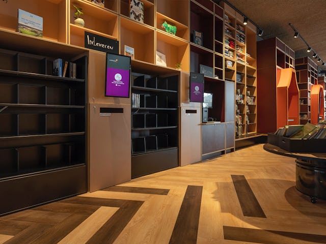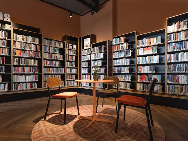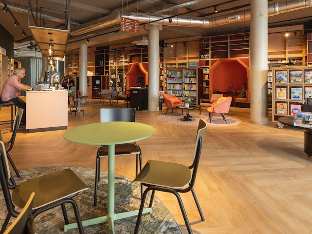 Bij binnenkomst worden bezoekers verwelkomd in een lichte, open ruimte. Een koffiebar met zitjes nodigt uit om te gaan zitten, iets te drinken en een boek of een krant door te bladeren. Om de openheid van de ruimte te behouden en de hoogte te
