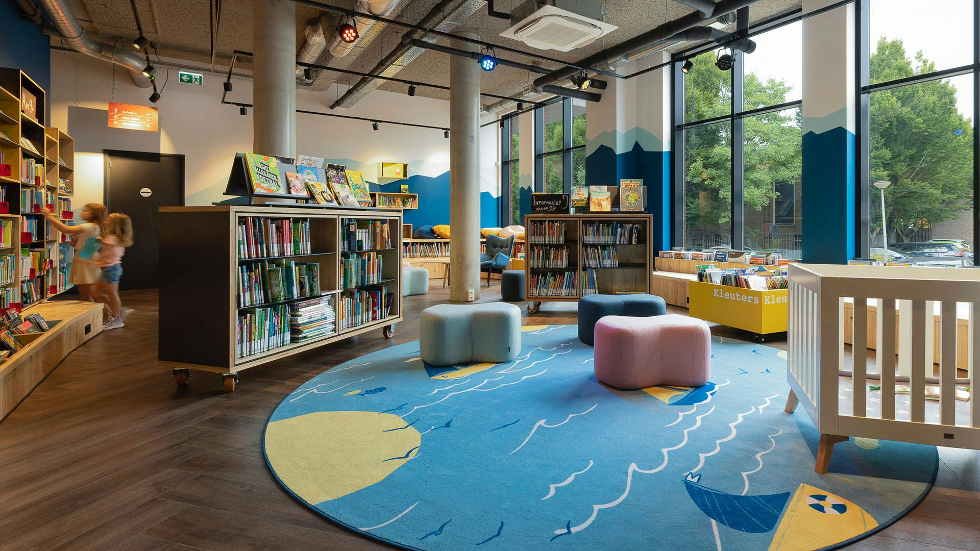 De nieuwe bibliotheek ligt op een bijzondere locatie aan de Amstel, waarbij de rivier de inspiratiebron vormde voor het interieur, niet alleen in kleur. Koele blauwe kleuren op de wanden contrasteren met het totale warme kleurenpalet. Dit is te zien op de achterwand van de kinderafdeling, beschilderd met abstracte blauwe golven. Oranje cocoons in de vorm van de typische huisjes langs de Amstel