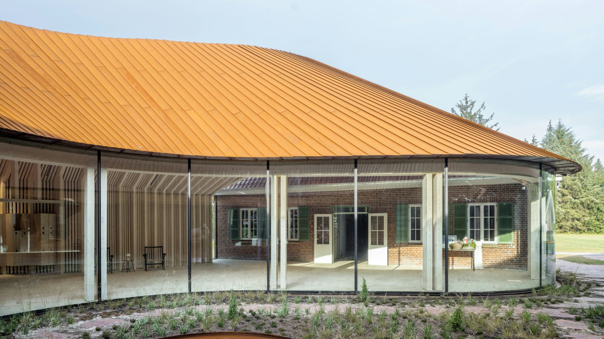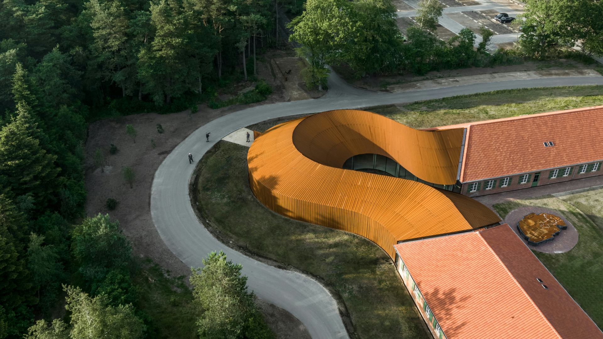 De structuur is bekleed met cortenstaal dat aansluit bij de rode bakstenen van de voormalige ziekenhuisgebouwen. Van buitenaf verwelkomt het abstracte volume bezoekers in wat een gesloten entreehal lijkt te zijn. Bij binnenkomst geeft een kamerhoge gebogen glazen wand zicht op een beschutte groene binnenplaats en het bos, waar vroeger het vluchtelingenkamp was. De binnenplaats laat licht binnen in de entreehal die fungeert als lobby of tijdelijke tentoonstellingsruimte waar gasten kunnen ervaren voordat ze hun reis vervolgen naar een van de museumvleugels.
