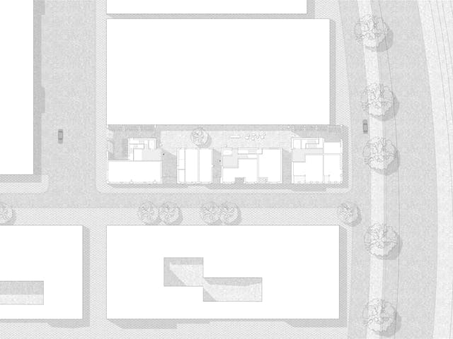 Het plan zoekt binnen de complexe randvoorwaarden met verschillende architectonische ingrepen naar de menselijke schaal en een bijzondere woonervaring. De massa is verdeeld in vier gebouwen met elk een eigen entreehal, typologie en karakter, en tegelijk aan de achterzijde verenigd rond het collectieve hof. De rationele compositie van gridgevels, refererend aan het industriële verleden van het gebied, wordt op straatniveau verbijzonderd: plintwoningen met hoge ramen, eigen voordeur en geveltuintjes, een collectieve buurtkamer op de hoek en een serie hoge poorten met doorzichten naar een verborgen binnenwereld. De entreehallen naar de appartementen en de collectieve fietsenstallingen liggen in de poorten en vormen samen met het hof een doorwaadbaar stedelijk interieur. Een doorlopende zacht golvende plint maakt verbinding met de monumentale zijgevel van de garage. Zo is deze ‘Stadscanyon’ niet alleen een functioneel lichthof dat een tweede oriëntatie geeft aan de woningen, maar ook een karakteristieke ontmoetingsplek die zich af en toe toont aan de straat en die onderdeel is van de dagelijkse routine van de bewoners.