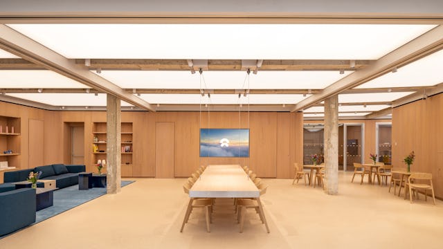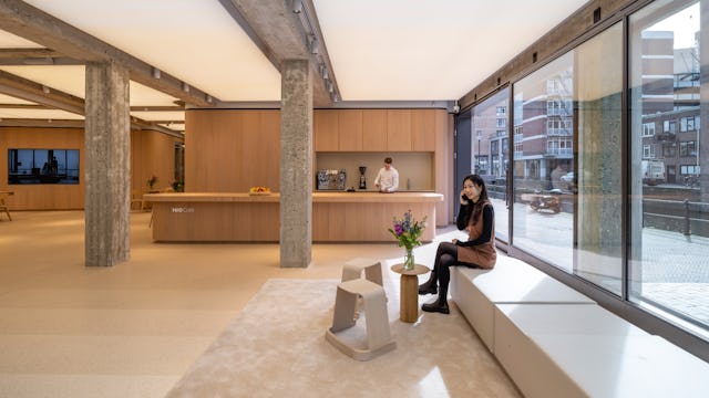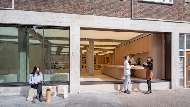 Binnen is door het kleurverloop in de vloer en wanden – van wit naar caramel – te zien waar de galerie aan de voorzijde van de showroom overloopt in het club- en cafégedeelte. Het typische materialenpalet van NIO vormde het uitgangspunt van het ontwerp, met een duurzame draai: de vloer bestaat uit terrazzo-achtig materiaal van ‘The Good Floor’, met als hoofdingrediënt gerecycled plastic opgevangen uit de Maas. Voor het meubilair is duurzaam gecertificeerd hout gebruikt met een coating op biologische basis. Tapijten en bekleding bestaan voor 100 procent uit natuurlijke vezels en veganistisch leer. Betonnen kolommen en andere robuuste details geven dit NIO House een vleugje Rotterdam, een goede aanvulling op de visie van NIO waarin het draait om puurheid en minimalisme.