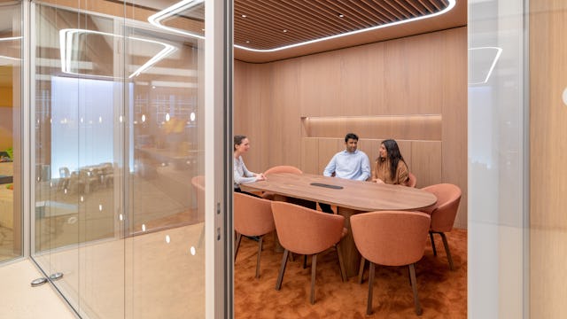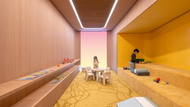 bevinden zich twee vergaderzalen met warmrode accenten, een verwijzing naar de rode bakstenen gebouwen van het industriële erfgoed in de stad. De speelruimte voor kinderen is uitgevoerd in een vrolijke tint geel.