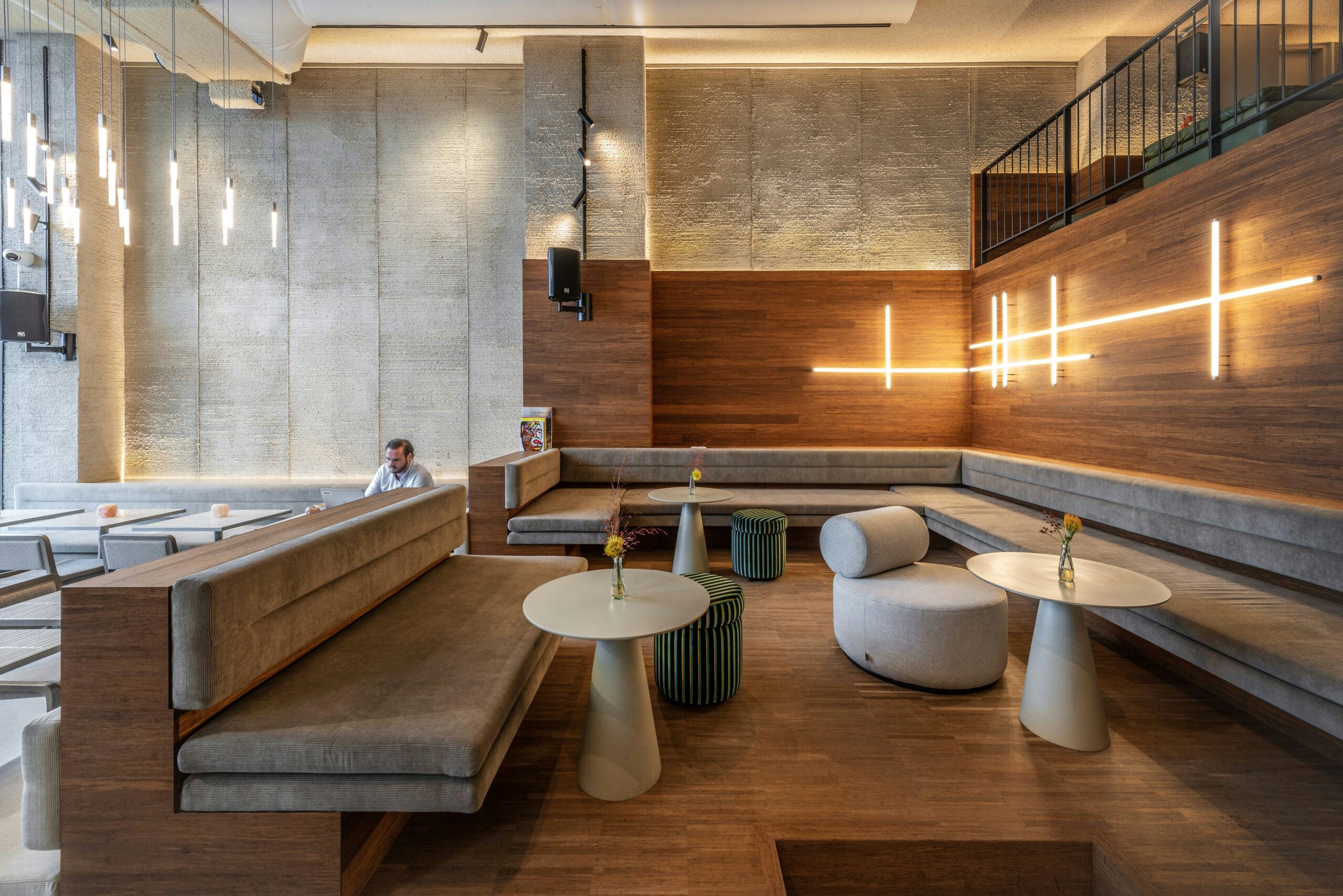 We kozen ervoor om een monochroom, persoonlijk en verleidelijk interieur te creëren, met een verscheidenheid aan nuchtere, comfortabele en persoonlijke ruimtes. We benadrukten de schoonheid van imperfectie en contrasteerden het gloednieuwe gebouw door het gebruik van gestructureerd hennepstucwerk; een natuurlijk materiaal dat ook nog is de akoestiek verbeterd. Chique en stijlvol.