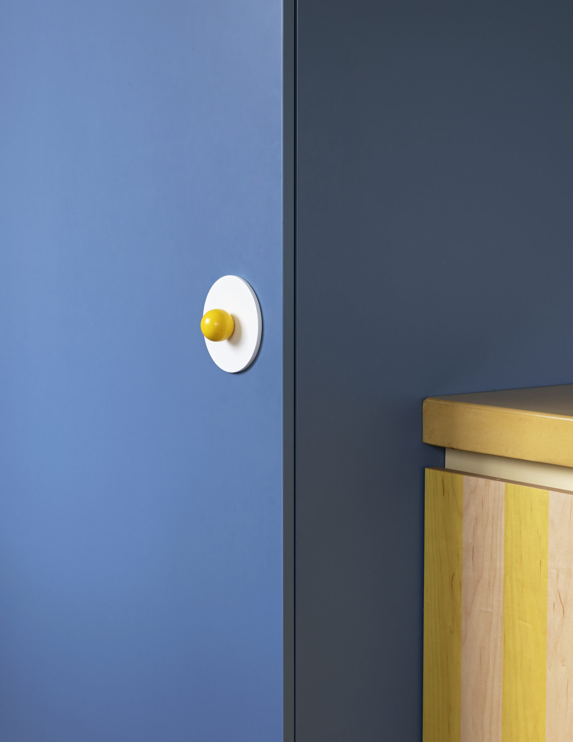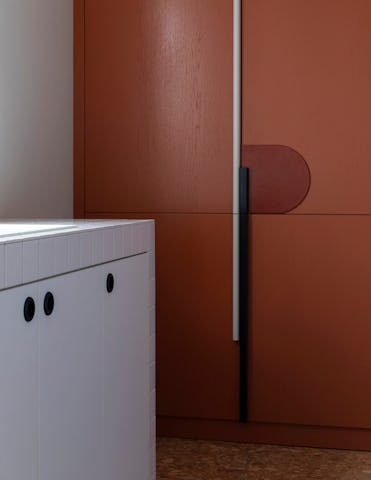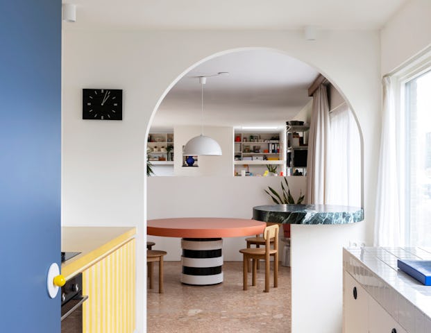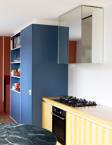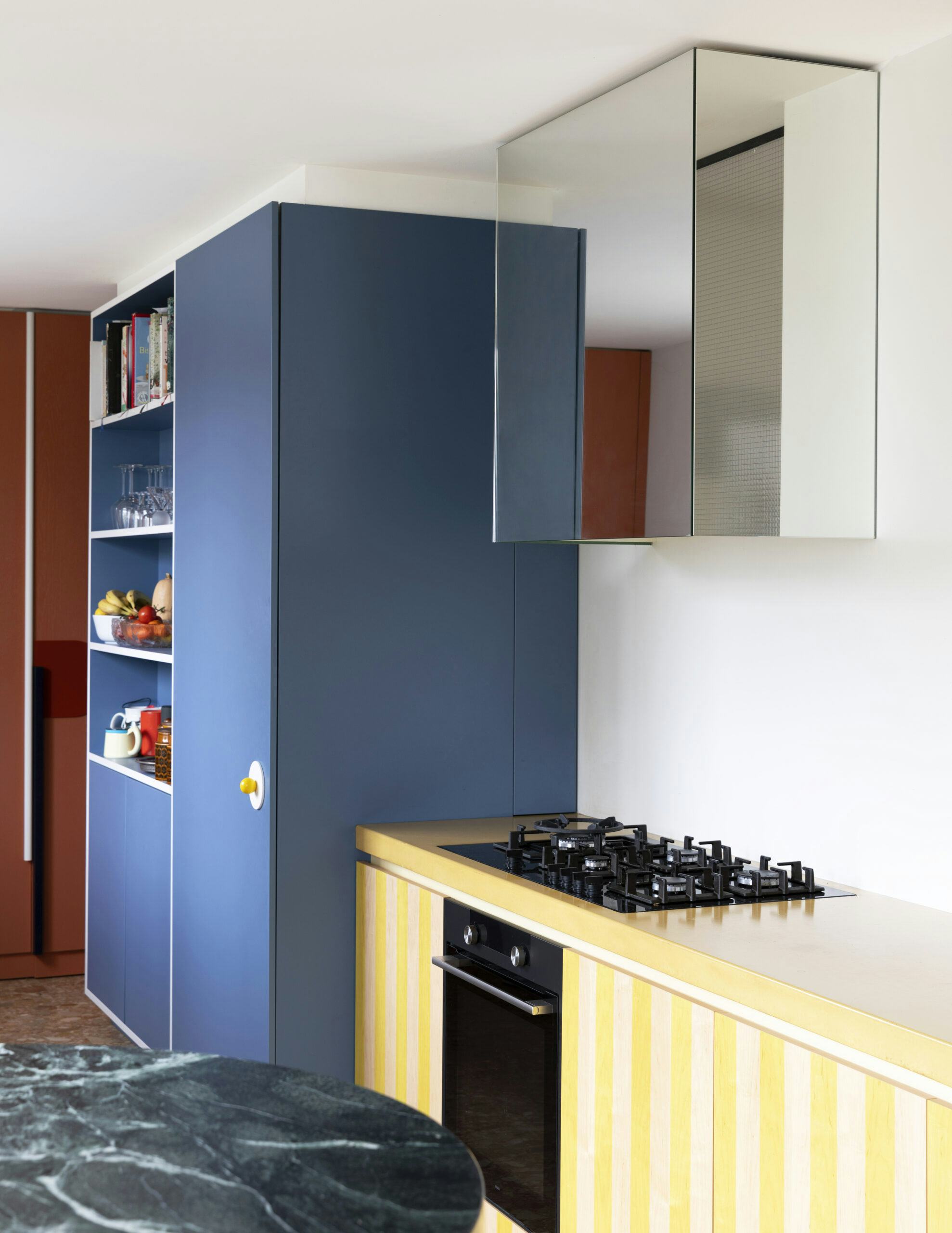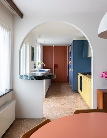 Als overgang tussen de keuken en de eetkamer creëerde Dries Otten een brede boogvormige doorgang. In die opening kwam een rond toogje in groene marmer. De keuken werd in vier grote blokken opgedeeld. Er is een groot, wit betegeld volume waarin de spoelbak en de vaatwasser zit. Daartegenover staat een gele kookzone met een geel betonnen werkblad en een afzuigkap in spiegel. Verder bevat de keuken een blauw hoog volume met daarin een extra grote koelkast en een kast voor kookboeken en decoratie. Helemaal achteraan in de rode kasten zit een pantry - een koffie nis - en ook de deur naar de kelder werd in dit geheel opgenomen.