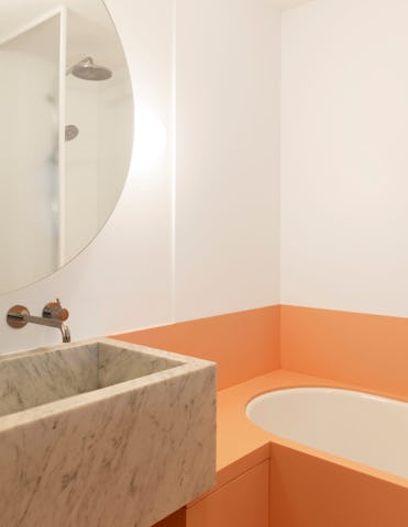In de badkamer bracht de ontwerpstudio een lambrisering aan in roze perzikachtige kleur. De wastafel en de plantenbak, die het toilet afschermt, werden in wit Carrara marmer uitgewerkt. Verder plaatste Otten een spatwand in draadglas, een ronde spiegelkast, en als haar tegenvorm een binnenvenster.