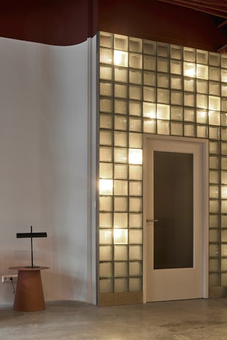 Het keukeneiland is het hart van de loft. Geplaatst tussen twee betonnen kolommen en uitgevoerd met blauwe tegels is het een stevig element, nodig in deze grote ruimte. Om het betonnen casco te doorbreken en licht te brengen in de middenzone is er een wand van glazen bouwstenen gekomen. Achter de wand zijn op willekeurige plekken lichtpunten geplaatst.