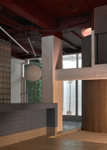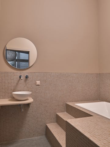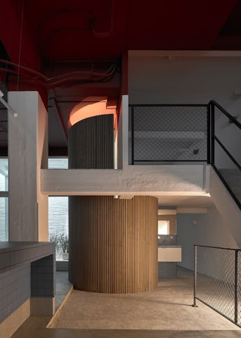 Als contrast met het beton zijn er ronde vormen en natuurlijke materialen toegevoegd. De cilinder op de verdieping is de douche. Hij staat los van het plafond en de muur zodat er licht kan doorschijnen. De houten bekleding geeft dit element een warme uitstraling.