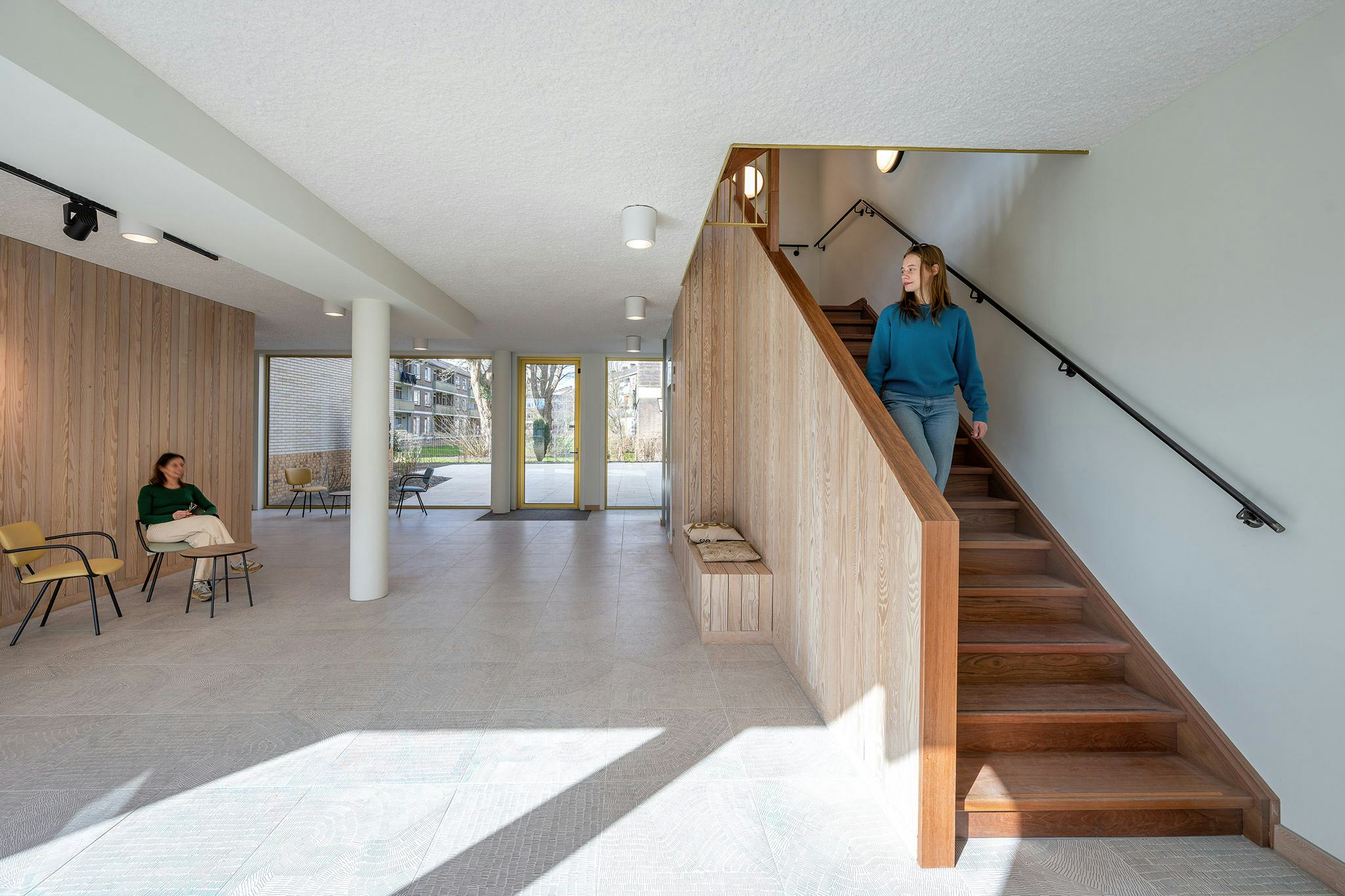 Ook in de gedeelde ruimtes faciliteert De Hoekstee deze gebruikers. Simone Drost wijst op de entree, de gangen en de trappen: 'Binnen het autisme-spectrum zijn er mensen die graag gezamenlijk optrekken en anderen die zich liever individueel bewegen. Daarom gaven we de entree, maar ook de gangen en het trappenhuis welbewust een zekere overmaat. Hier kunnen bewoners elkaar passeren zonder in elkaars "ruimte" te treden en is er voldoende plek om in die gedeelde ruimte op jezelf te blijven, zoals mensen met ASS graag willen. Zo ontwierpen we intieme zitjes in de diepe vensterbanken. Tegelijkertijd geeft de overmaat in de gangen en het trappenhuis ruimte voor ontmoeting en interactie van groepjes bewoners.'