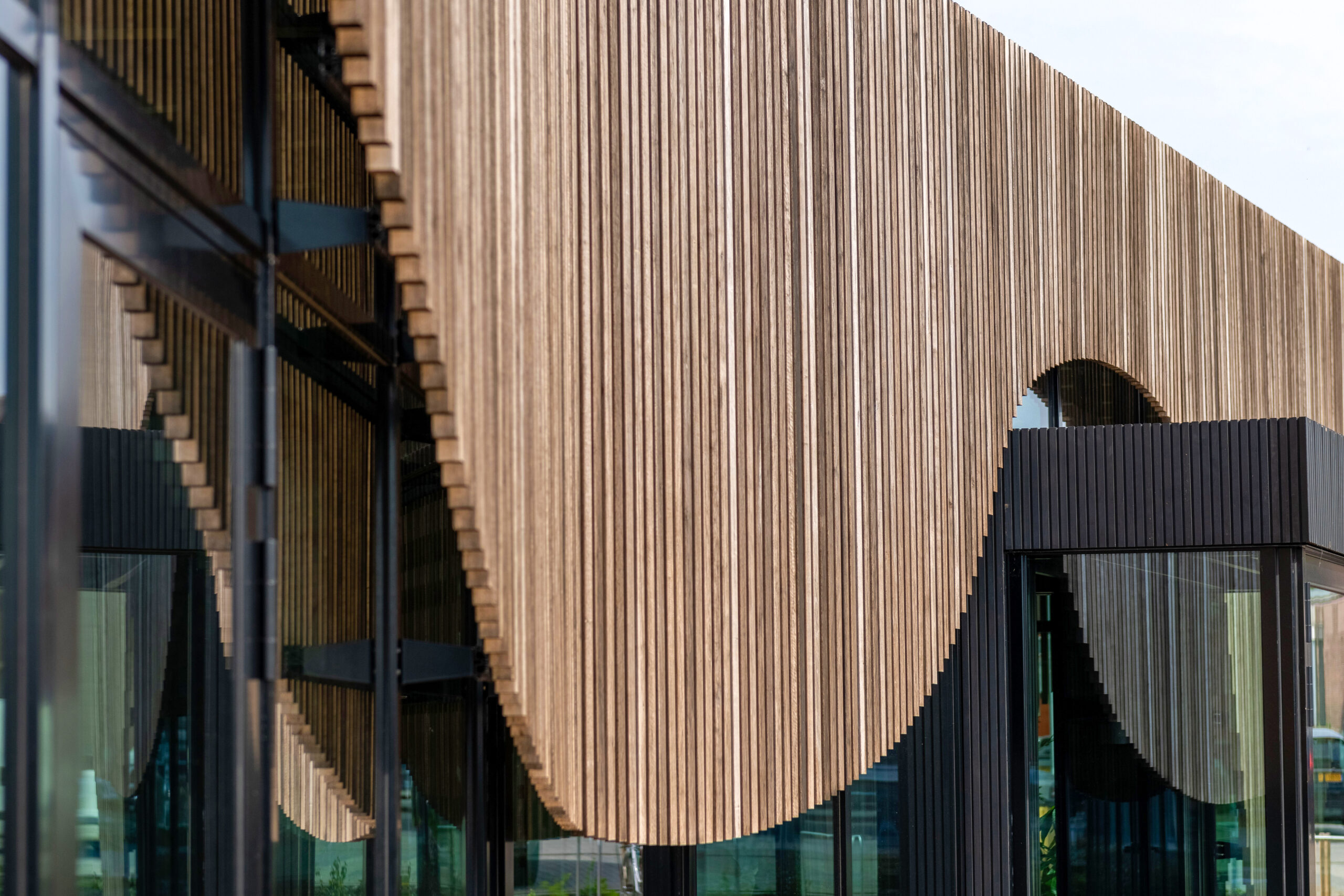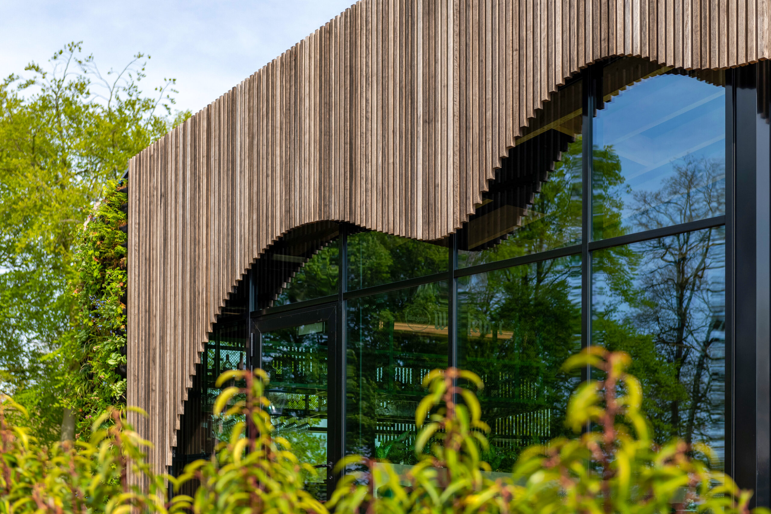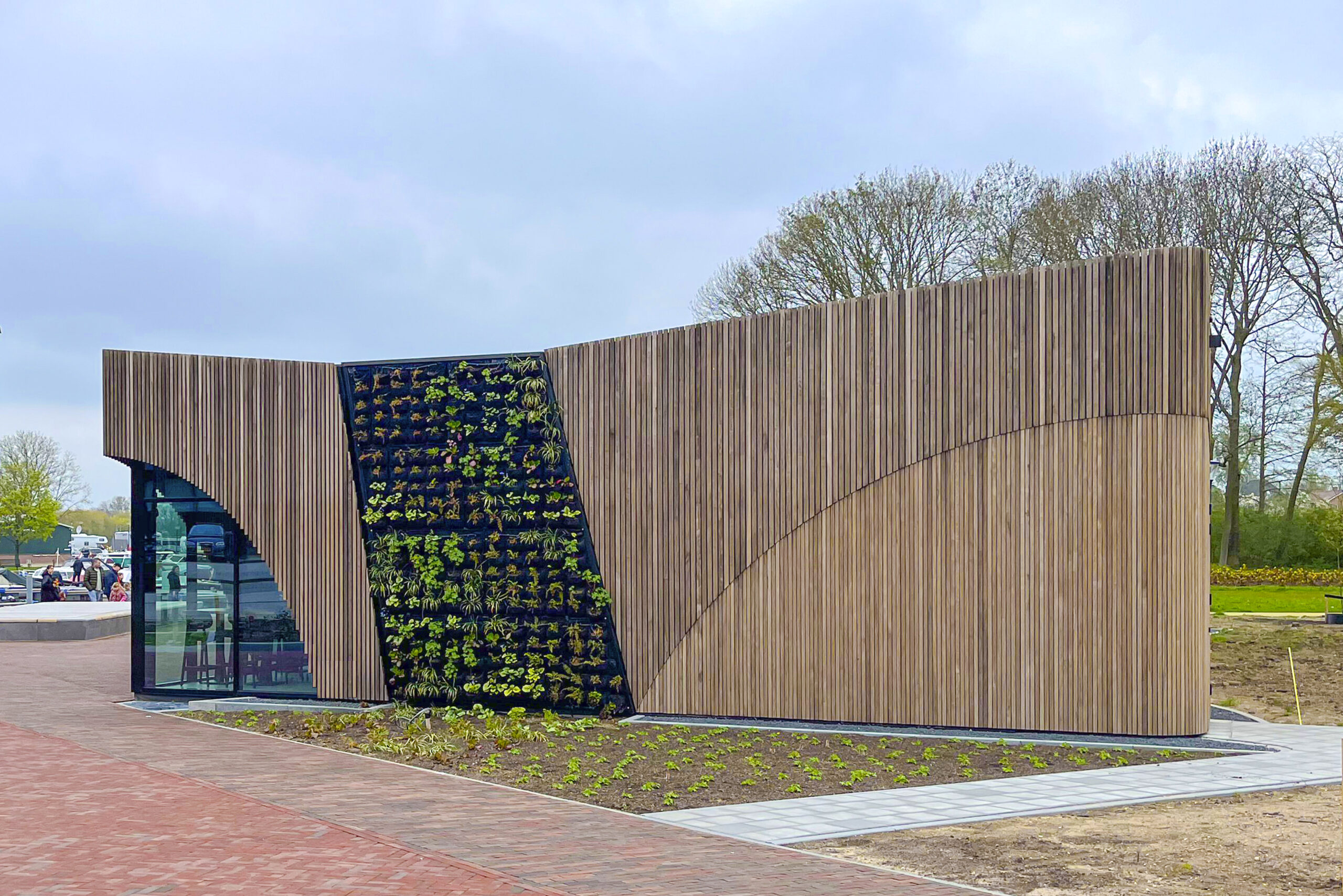 Door de vormgeving, het materiaalgebruik en de positionering gaat het gebouw een natuurlijke relatie aan met alle omliggende elementen.De niet grondgebonden groene gevel en de groene dakstrook over het gebouw die doorloopt in het aangrenzende park, hebben naast een esthetische ook duurzame functie. Waterberging, flora en fauna zijn hier allen bij gebaat. Uniek is het door het golvende lijnenspel omkaderde weidse uitzicht dat zo is uitgekiend dat het ook dienst doet als zonwering.