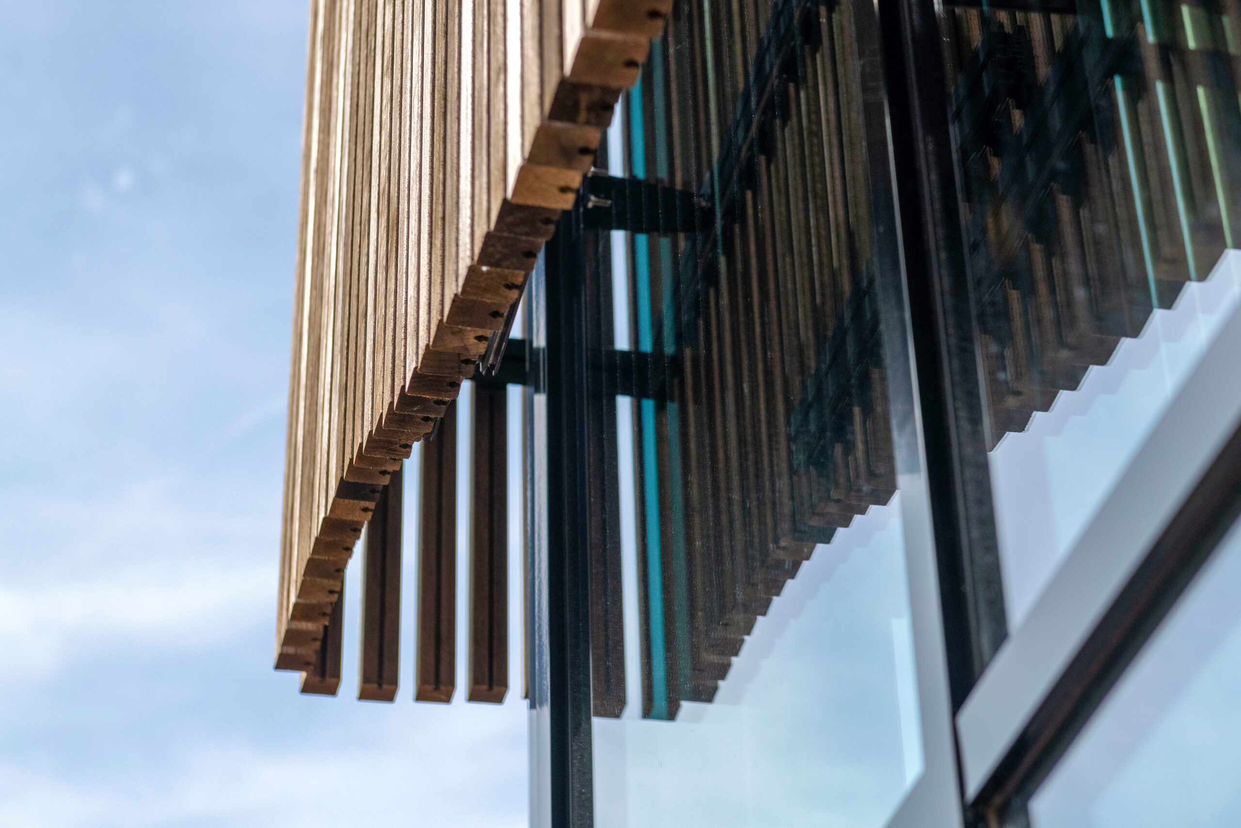 Duurzaamheid is een belangrijk ontwerpuitgangspunt. Een warmtepomp en zonnepanelen zorgen voor de energie van dit goed geïsoleerde, onderhoudsarme en demontabele gebouw. Interieur en exterieur lopen vloeiend in elkaar over door het gebruik van natuurlijke materialen, de zorgvuldige plaatsing van de glazen gevels waardoor het gebouw ook binnen sterk verbonden is met de haven en het park, en houten gevels waarvan de plaatsing zo uitgekiend is dat deze de zichtlijnen optimaliseren. De groenstrook vormt de brug tussen het centrum, park en de haven. Deze loopt geheel door in het interieur.