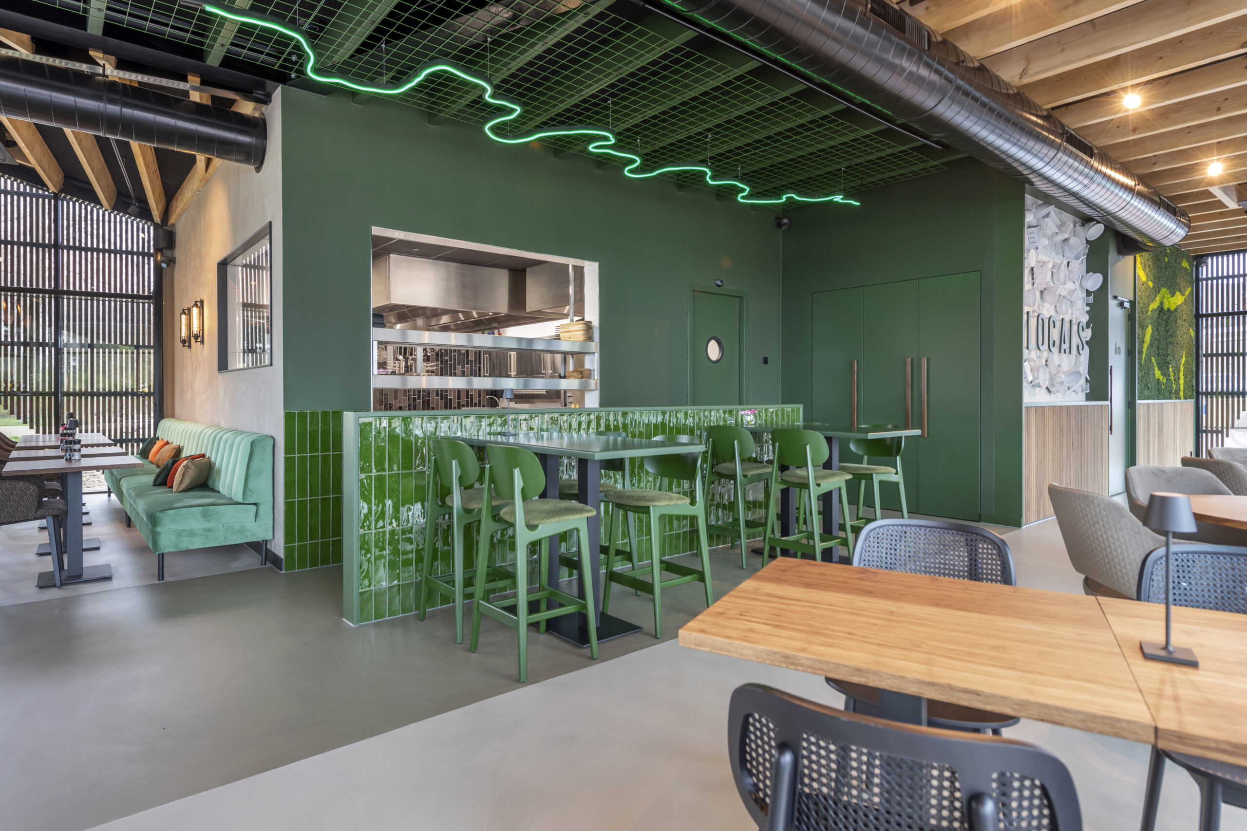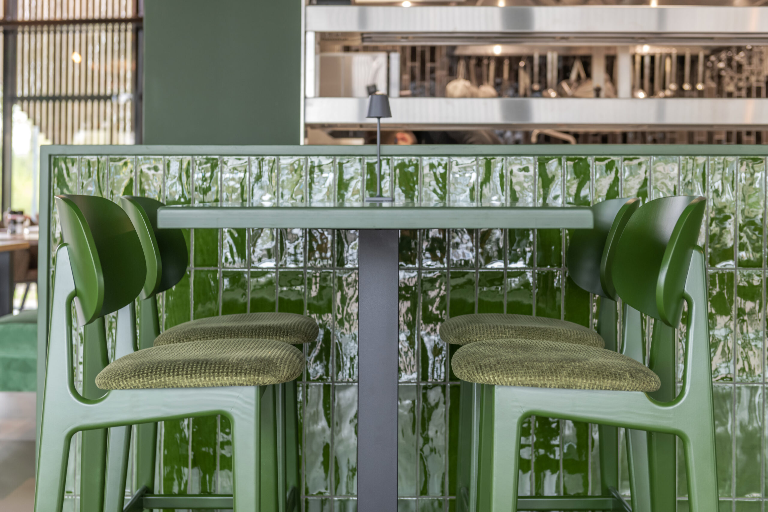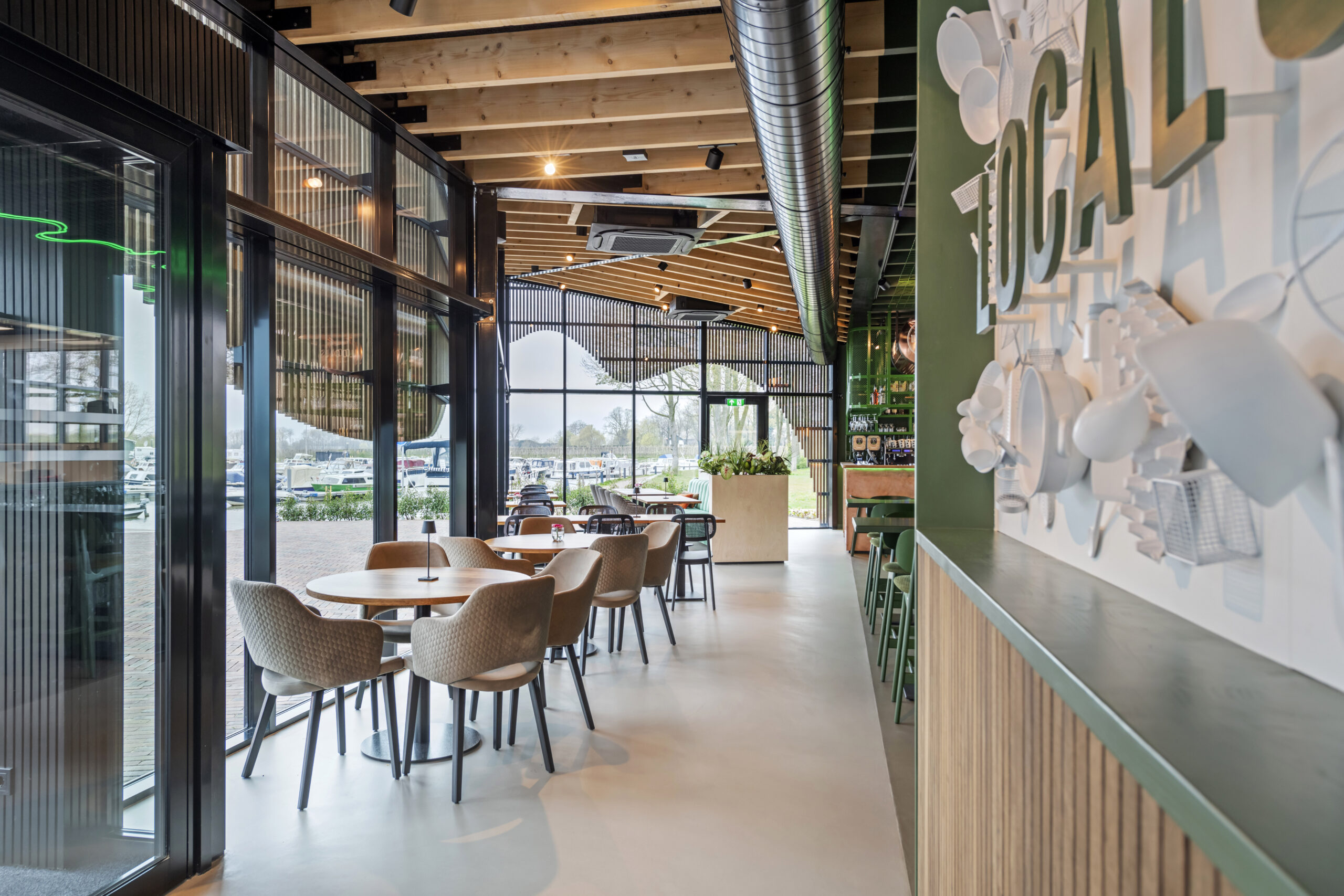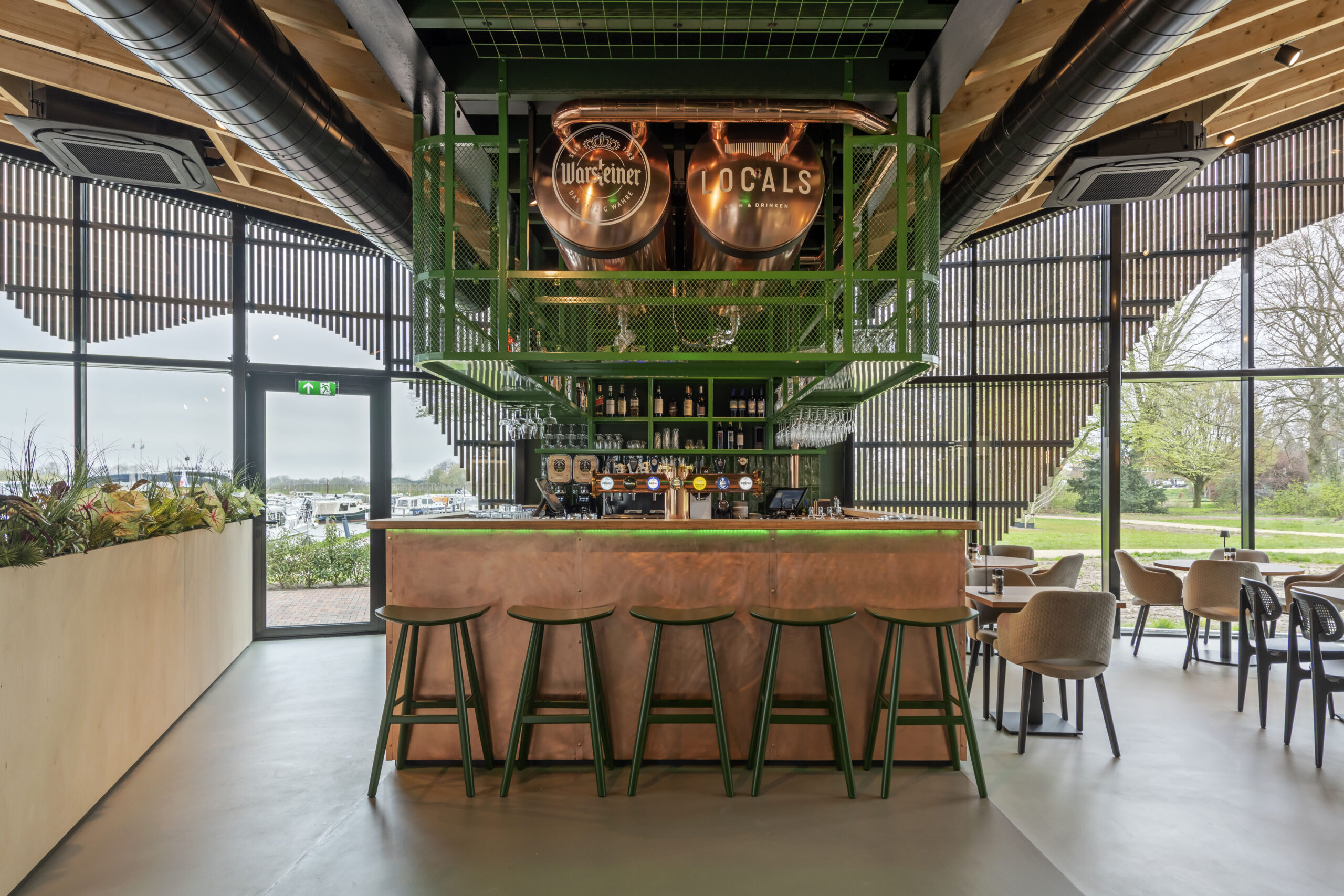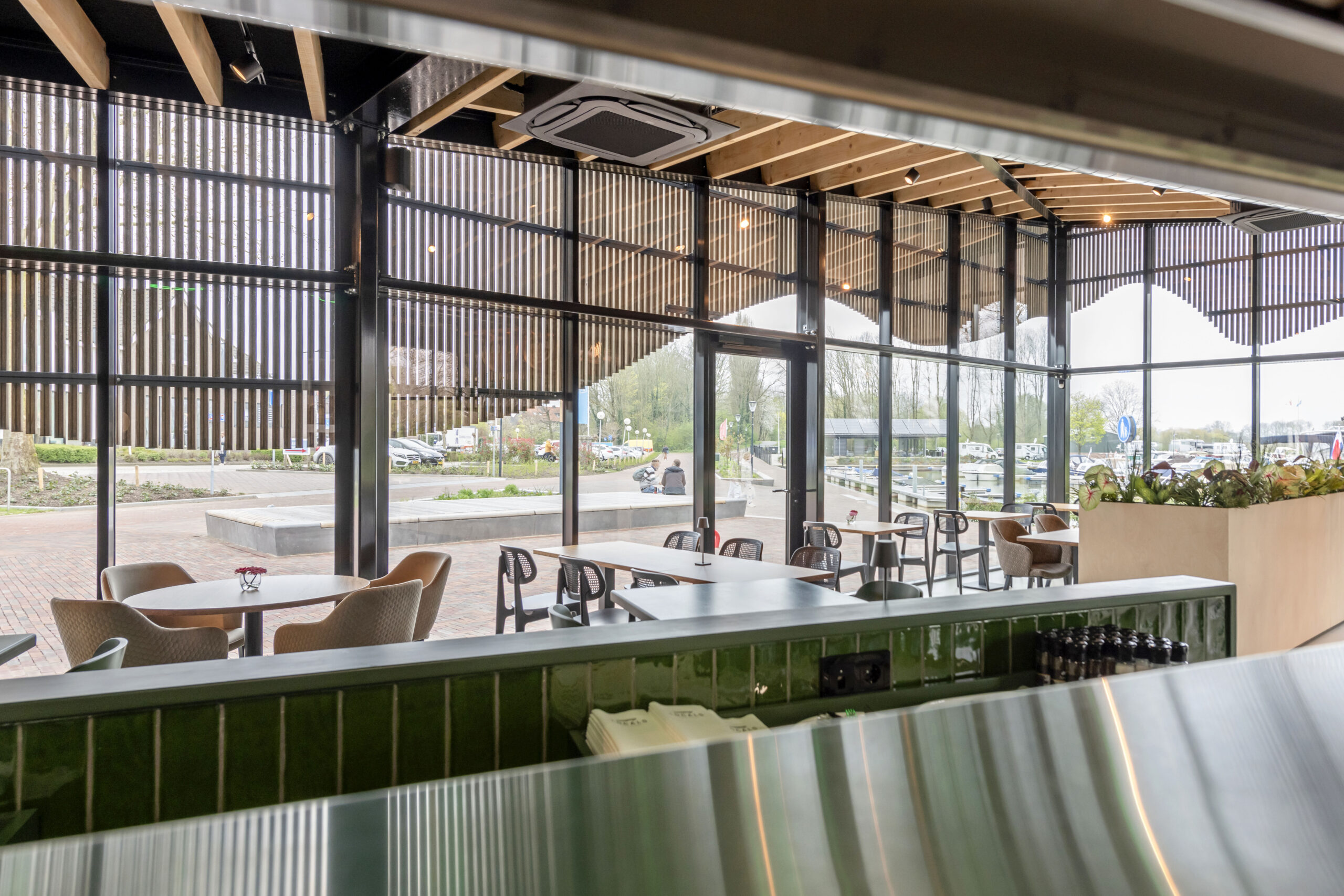 De geometrische vorm van het gebouw omarmt het park en de haven, de opgetilde gevelpunten openen het gebouw richting de mooie en levendige omgeving en de groenstrook over de gevel die doorloopt in het aangrenzende park versterkt nog eens deze verbinding. Mooi is het contrast tussen het modern vormgegeven restaurant en de naastgelegen historische kerk.