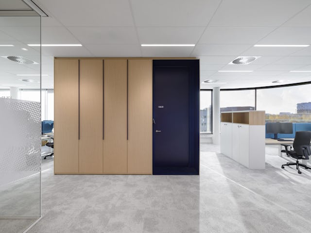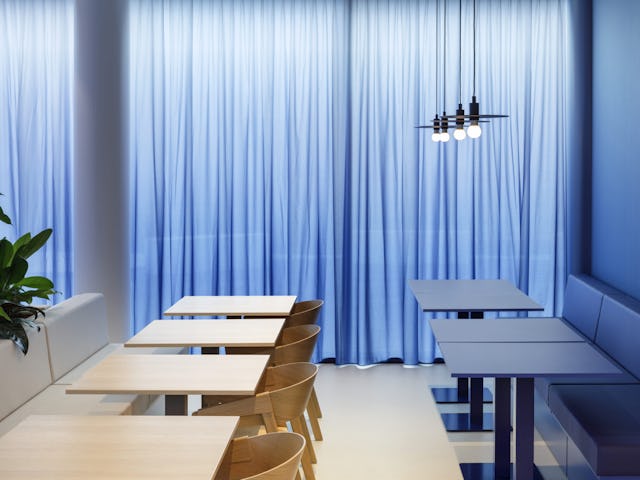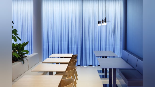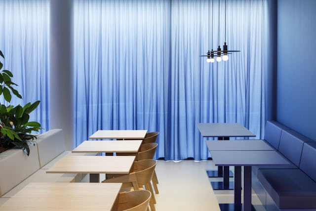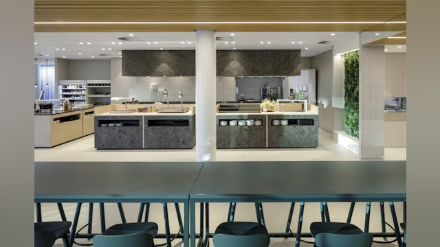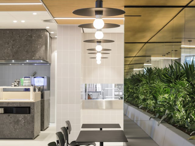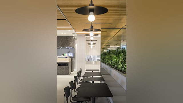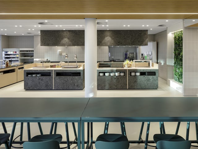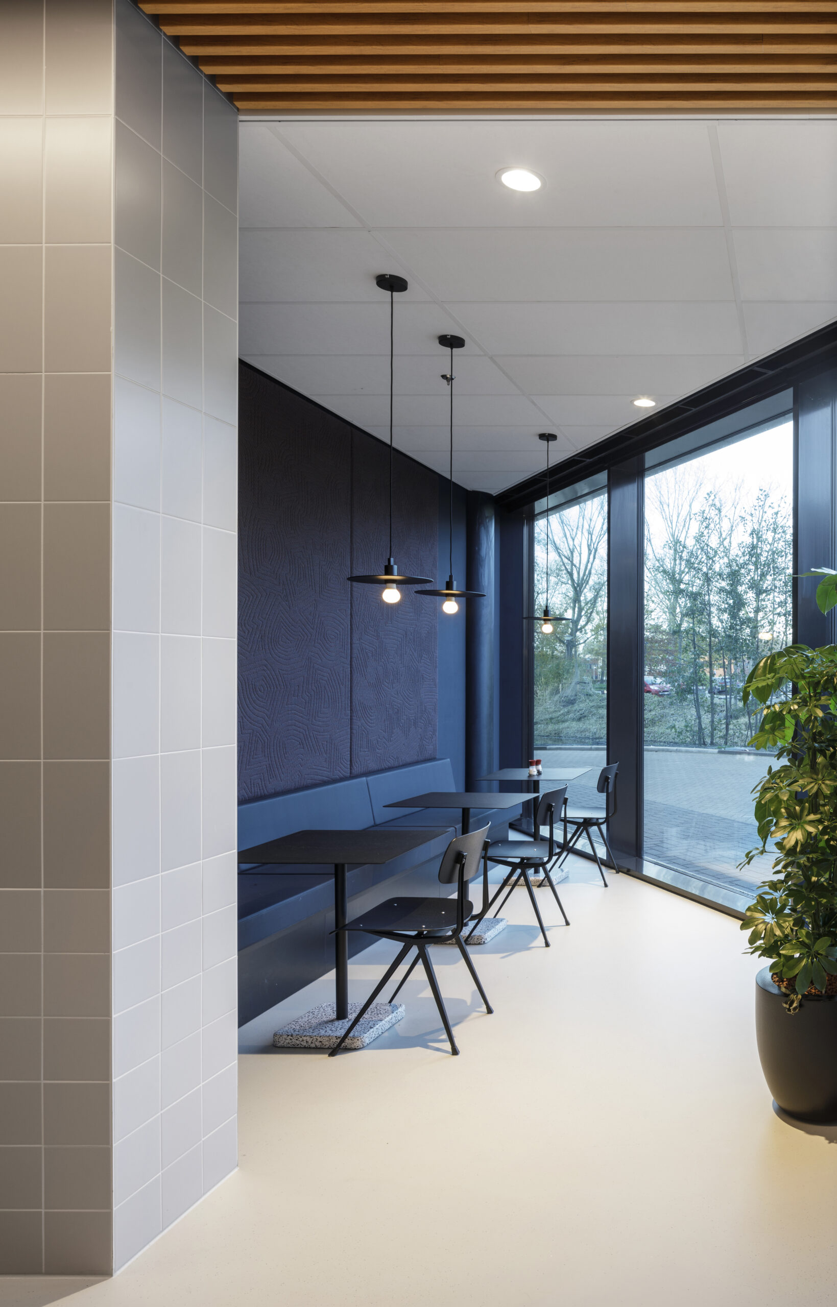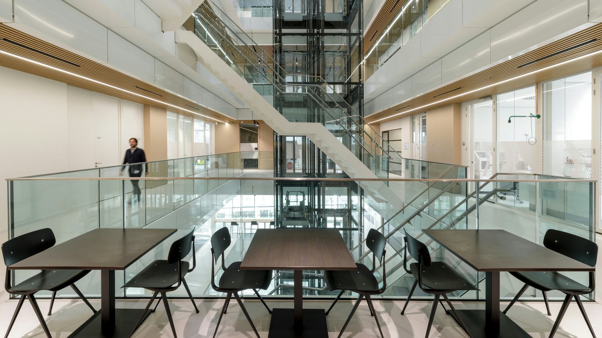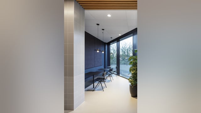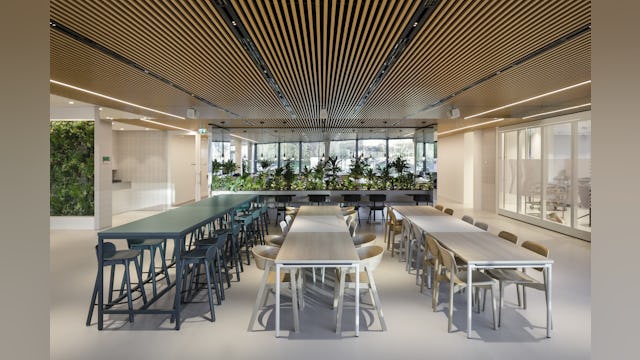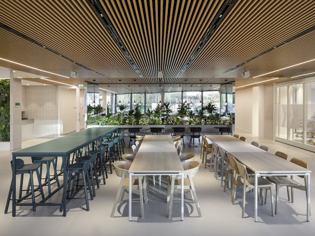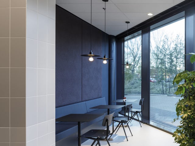 Het bedrijfsrestaurant functioneert als werkcafé. Op deze manier is het continue in gebruik - en niet enkel tijdens pauze momenten - maar biedt het ook ruimte om flexibel te werken. Door een veelvoud van zitmogelijkheden toe te passen is het geschikt voor verschillende groepsgroottes en activiteiten. Vouwwanden in het restaurant verlenen toegang tot ruimtes voor bijvoorbeeld vergadering en workshops en kunnen tegelijkertijd bij het hele restaurant getrokken worden.