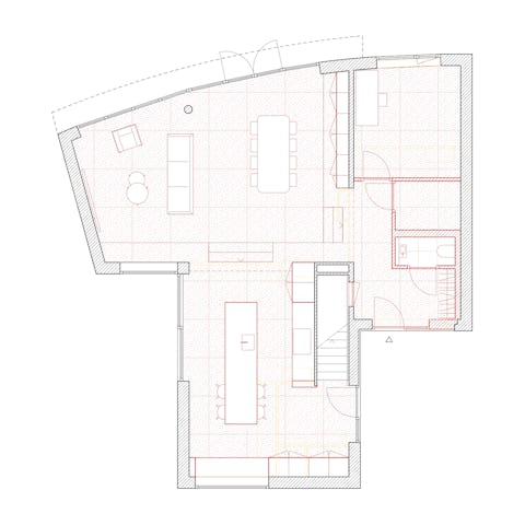 Het perceel van het huis kenmerkt zich door een hoogteverschil, tussen de straat aan de voorzijde en het water aan de achterzijde. De hieraan gerelateerde verspringing in de vloer van de begane grond was voorheen nauwelijks zichtbaar, maar is met de verbouwing een integraal onderdeel van het interieur geworden. De verhoogde vloer is verlengd tot in de woonkamer, waardoor de vloerovergangen nu een zichtbare bijdrage leveren aan de ruimtelijke beleving.