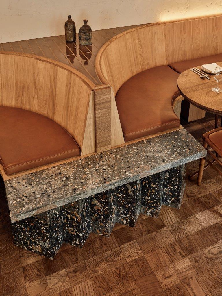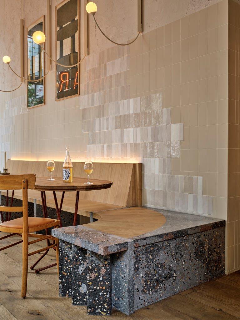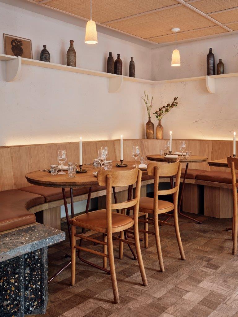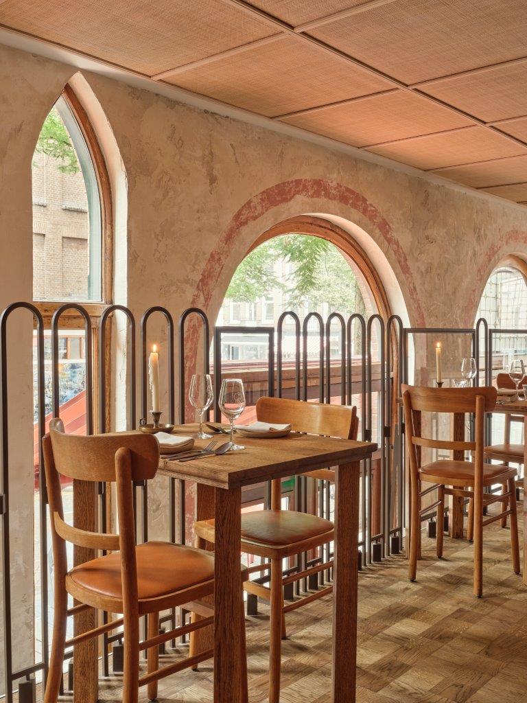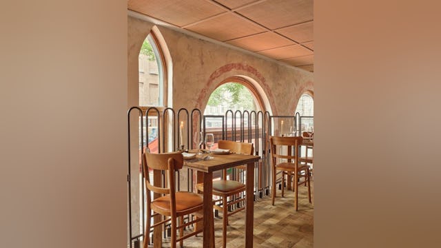Hoge, op maat gemaakte lampen die aan het plafond hangen, versterken de hoogte van de kamer, terwijl gebogen lampen in dezelfde stijl, maar met speelse lichtbollen, uit de muur groeien achter een lange, op maat gemaakte banket aan de linkerkant. Aan deze zijde bevindt zich een abstract tegellandschap waar lichtgekleurd ruw stucwerk samenkomt met een patroon van witte tegels. Samen vormen ze een lappendeken van texturen en tinten die kronkelt van de voorkant van het restaurant, langs de bar, helemaal naar de keuken. Het heeft een tijdloze uitstraling dankzij de gelaagde afwerkingen en materialen die de indruk wekken te onthullen hoe de kamer voorheen is ingericht. Aan de andere kant van de begane grond bieden kleine tafels een meer intieme setting naast hoge boogramen. De ramen worden gedefinieerd door vervaagde zachte rode contouren en worden versterkt door conische keramische wandlampen. De achtergrond heeft een verweerd uiterlijk gekregen en wolken van verschillende beigetinten mixen en matchen over de hele lengte van de muur.