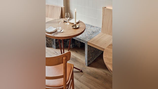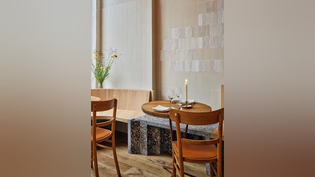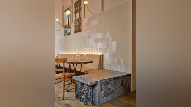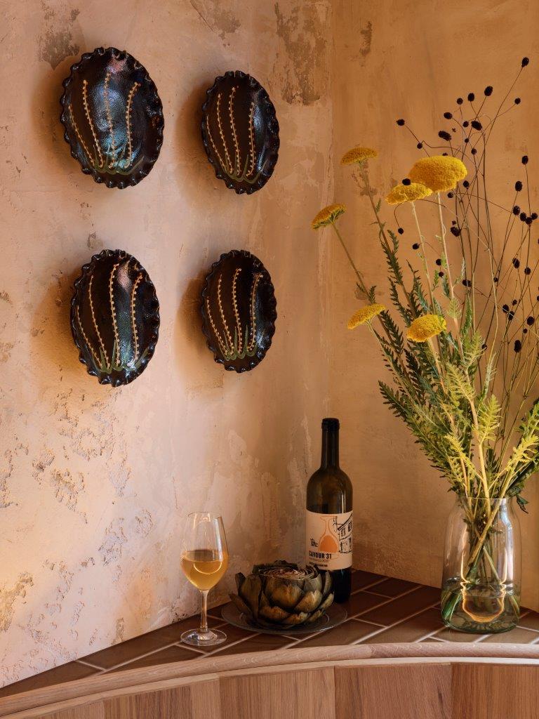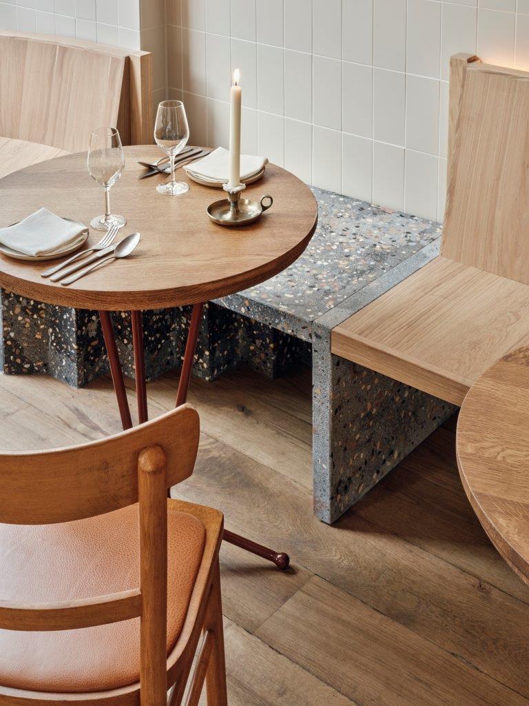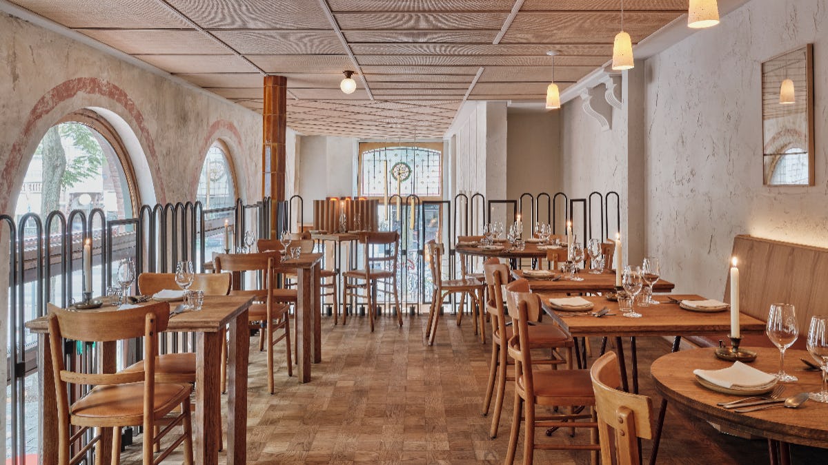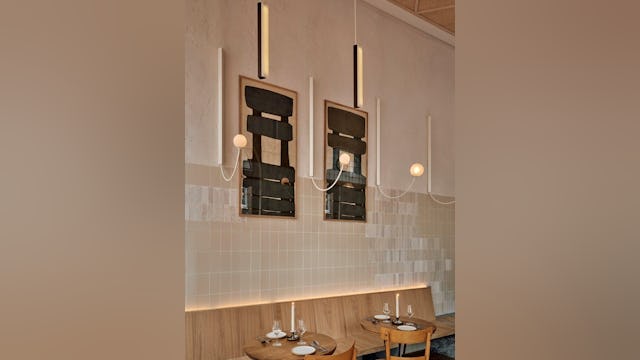 Hoge, op maat gemaakte lampen die aan het plafond hangen, versterken de hoogte van de kamer, terwijl gebogen lampen in dezelfde stijl, maar met speelse lichtbollen, uit de muur groeien achter een lange, op maat gemaakte banket aan de linkerkant. Aan deze zijde bevindt zich een abstract tegellandschap waar lichtgekleurd ruw stucwerk samenkomt met een patroon van witte tegels. Samen vormen ze een lappendeken van texturen en tinten die kronkelt van de voorkant van het restaurant, langs de bar, helemaal naar de keuken. Het heeft een tijdloze uitstraling dankzij de gelaagde afwerkingen en materialen die de indruk wekken te onthullen hoe de kamer voorheen is ingericht. Aan de andere kant van de begane grond bieden kleine tafels een meer intieme setting naast hoge boogramen. De ramen worden gedefinieerd door vervaagde zachte rode contouren en worden versterkt door conische keramische wandlampen. De achtergrond heeft een verweerd uiterlijk gekregen en wolken van verschillende beigetinten mixen en matchen over de hele lengte van de muur.