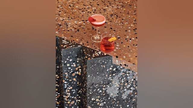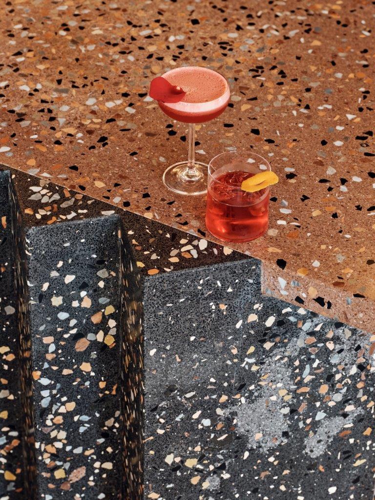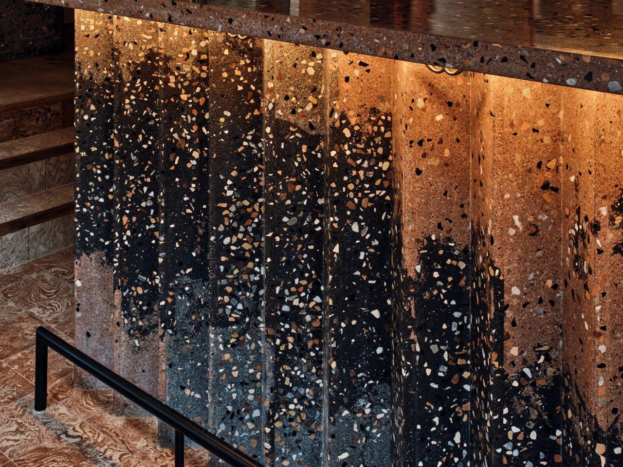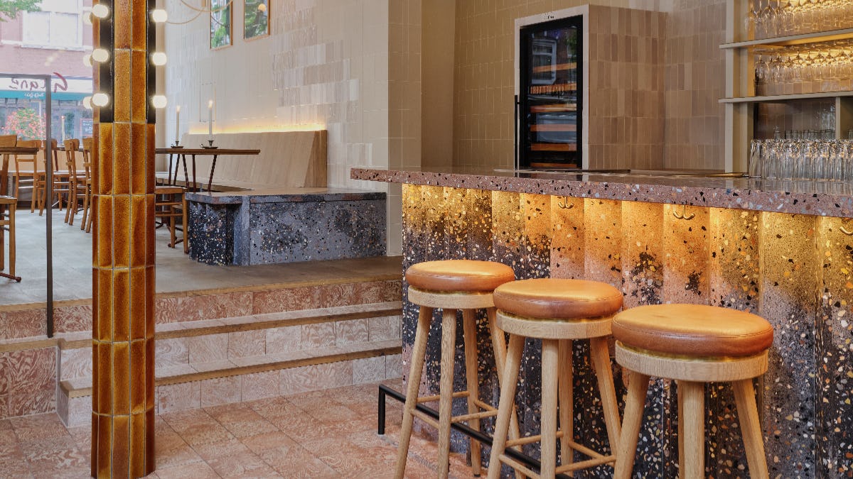 Twee treden lager dan de begane grond bevindt zich de bar. Het is een sculpturale showstopper in een opvallende zigzagvorm, gemaakt met een unieke terrazzomix van grijstinten met roze accenten. De zigzagvorm weerspiegelt de geometrie van de bakstenen buitengevel en komt terug in de zitelementen binnenin. Een gemarmerde tegelvloer contrasteert met de neutrale kleuren van de delicate achterbalk, die op een houten voet staat. De achterbalk volgt de plafondgeometrie en ontwikkelt zich symmetrisch op de achterwand. Aan de ene kant nodigt een grote koelkast gasten uit om het zorgvuldig samengestelde assortiment natuurlijke wijnen te bekijken, terwijl ze aan de andere kant een glimp kunnen opvangen van wat er in de keuken wordt bereid. Deze intieme ruimte wordt verhoogd door een donkerbruin, verouderd spiegelplafond. Het weerspiegelt de lichtbollen op het plafond en de patronen van de sculpturale bar eronder, waardoor het spel tussen robuuste, verweerde materialen en de frisse tegels en terrazzo wordt vastgelegd. Het barplafond wordt ondersteund door een kolom. Door het af te werken met lavategels met een rijke textuur en er kleine lichtjes als accenten aan te geven, veranderde Studio Modijefsky een eenvoudig structureel stuk in een verticaal ontwerpelement. Terwijl de kolom vanuit het souterrain helemaal omhoog gaat naar de balustrade van de tussentrap, verbindt deze visueel alle drie de ruimtes van Gitane.