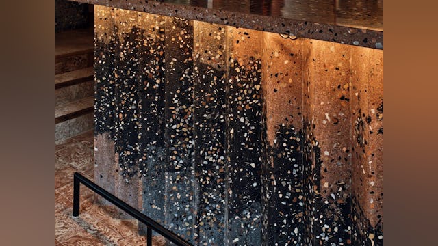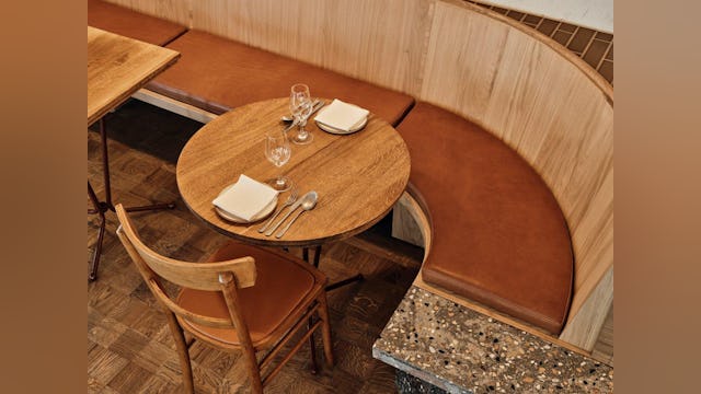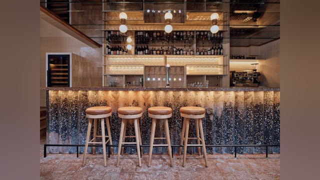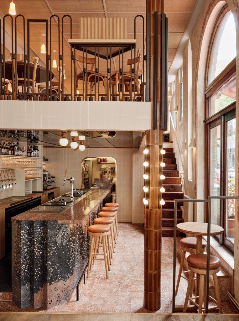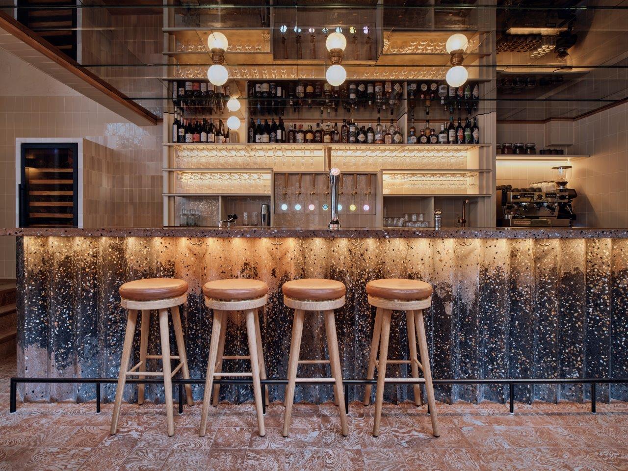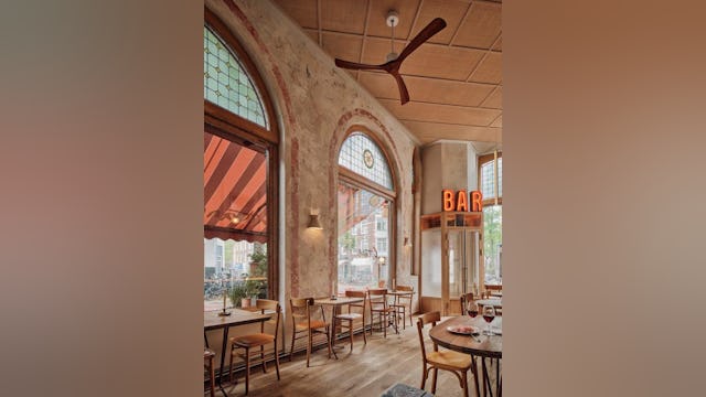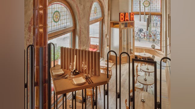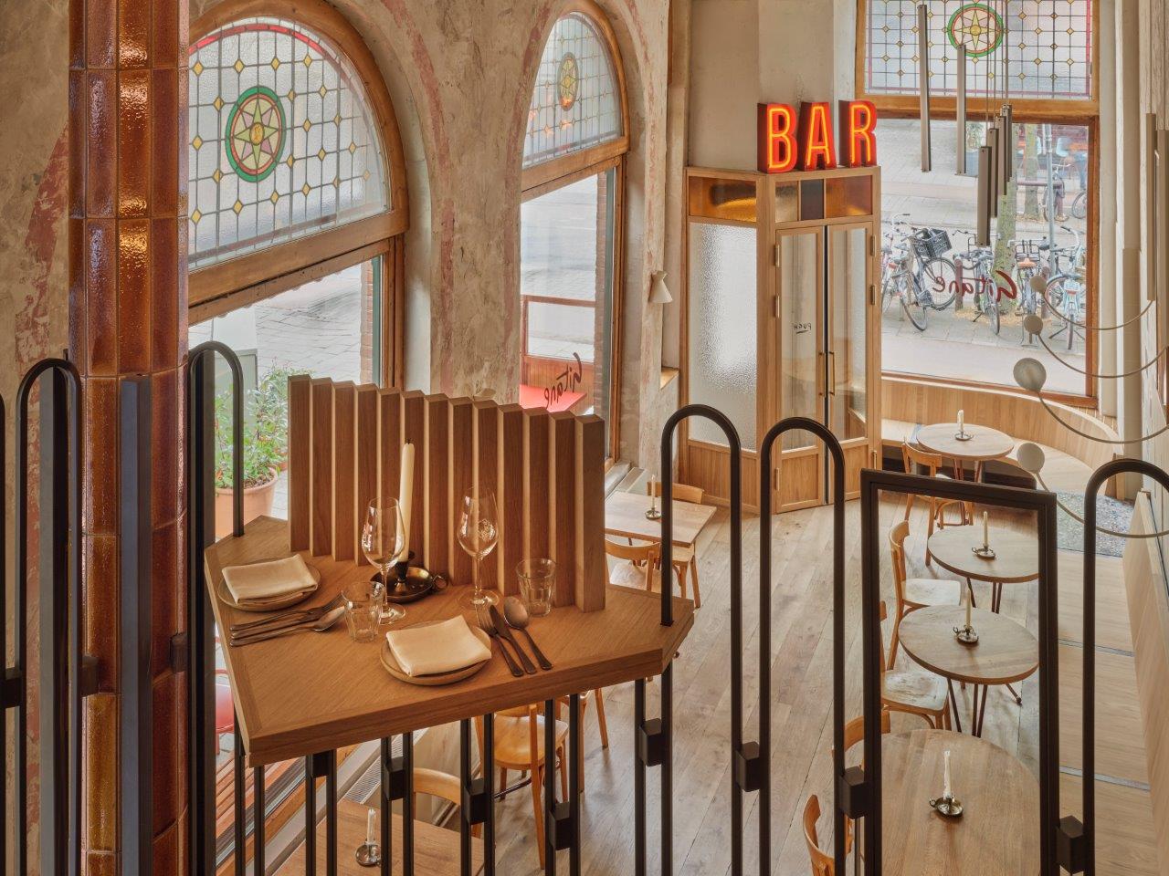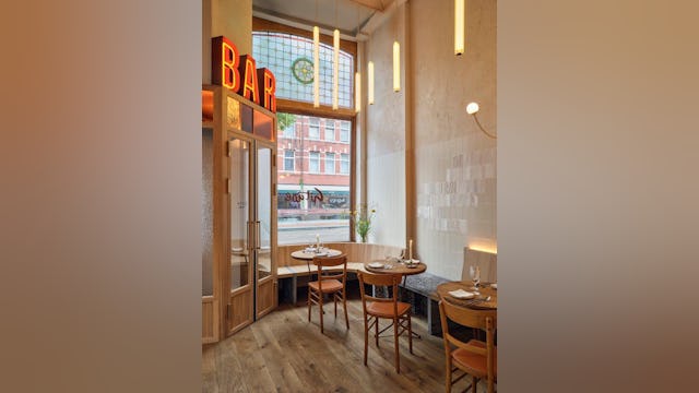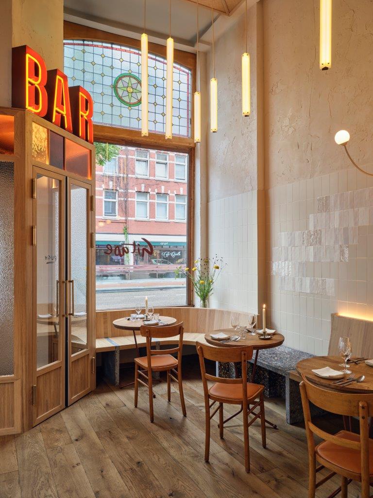 De hoofdingang is via een houten vestibule met gekleurd glas. Het brengt je in de dubbelhoge restaurantruimte, waarover grote donkeroranje neonletters met de spelling ‘BAR’ een warme gloed verspreiden vanaf de bovenkant van de vestibule. De warmte van het licht en het hout van de vestibule zetten de toon voor de begane grond. Je bent omringd door klassiek en op maat gemaakt houten meubilair: vintage caféstoelen, sommige met donkeroranje leren stoelen; op maat gemaakte barkrukken met lederen afwerking; tafelbladen met verfijnde details; vloeren gemaakt van hergebruikte houten planken; en lange op maat gemaakte banken die het belangrijkste ruimtelijke element op de begane grond en de tussenverdieping vormen. Deze banken hebben een uniek karakter dankzij geïntegreerde terrazzo-oppervlakken en een combinatie van heldere lijnen en subtiele details.