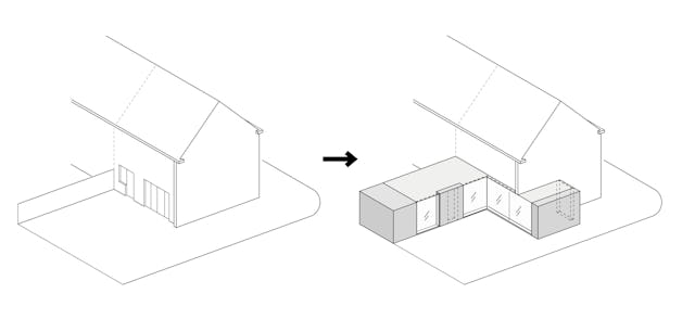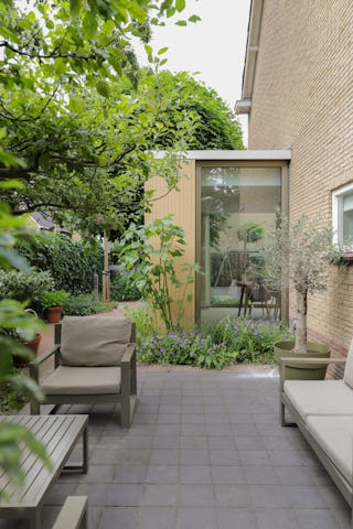 Lastig bij deze vraag was dat de extra kamer bij de meeste oplossingen de toegang tot de tuin blokkeerde. Bij nadere bestudering van de stedenbouwkundige richtlijnen bleek dat aan de achterzijde meer ruimte gecreëerd kon worden als ook aan de zijkant van de woning een uitbouw zou worden gemaakt. Door de zij-en achteraanbouw te scheiden sloot het programma mooi aan en voelde de tuin zelfs groter en meer verbonden met binnen.