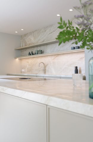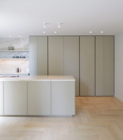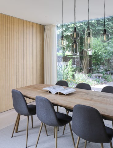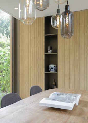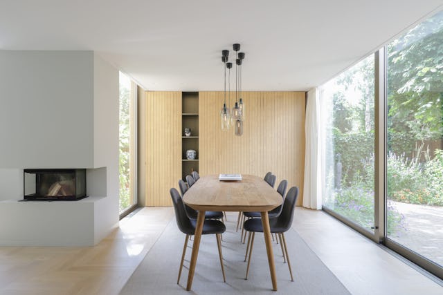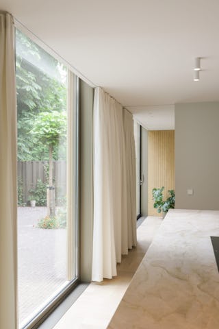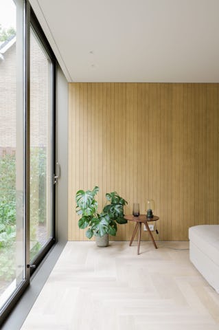 Visueel is er voor gekozen om de twee uitbouwen met elkaar te verbinden, waardoor een mooi panoramaraam naar de tuin kon worden geplaatst. Door al deze ingrepen veranderde het woonkamerplan van een lineair georiënteerde naar een multidirectionele ruimte. Eentje die meer zou associeren met een modernistische villa dan met een hoekrijhuis.