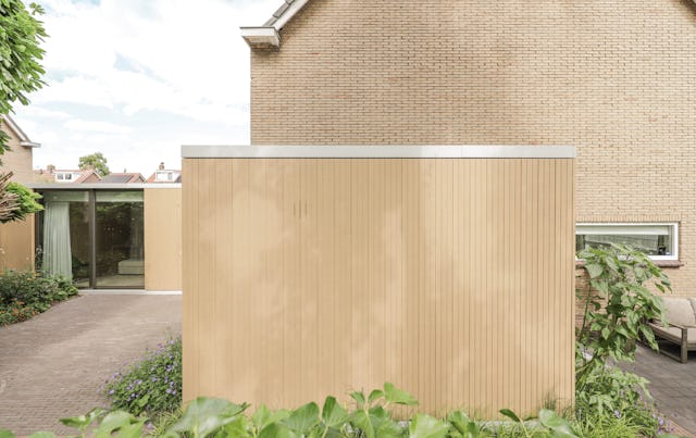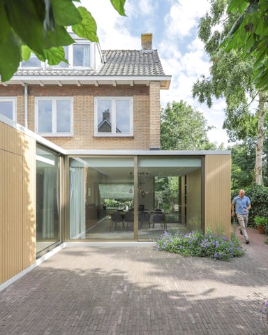 De gebruikte materialen en kleuren in de gevel bouwen voort op het bestaande palet, maar de tektoniek en detaillering zijn veel eigentijdser. De verschillende oppervlakken liggen in hetzelfde vlak of hebben juist een flinke terugsprong. De plint en dakrand zijn zo gedetailleerd dat de uitbouw een slanke, elegante uitstraling krijgt, in tegenstelling tot wanneer de nogal ruwe hoogte van het goed geïsoleerde dak direct was doorgezet in de dakrand. Alles tussen de twee ranke lijnen loopt van vloer tot plafond, waardoor zowel exterieur als interieur ondanks de complexe oriëntaties een rustig figuur krijgen.