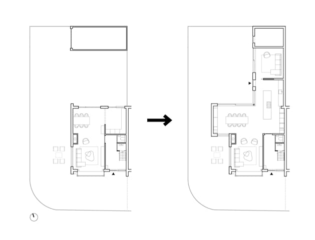 Bij deze woningrenovatie waren het de planningsrichtlijnen die het bureau inspireerden om van een standaard hoekrijhuis een plattegrond van een soort villa op de begane grond te maken. De opdrachtgevers wilden hun begane grond uitbreiden om hun eetruimte te maximaliseren en een aparte recreatieruimte voor de kinderen te realiseren.