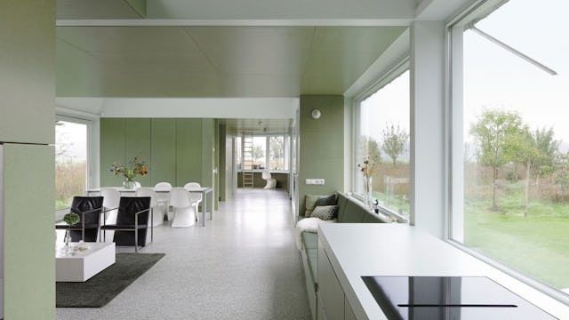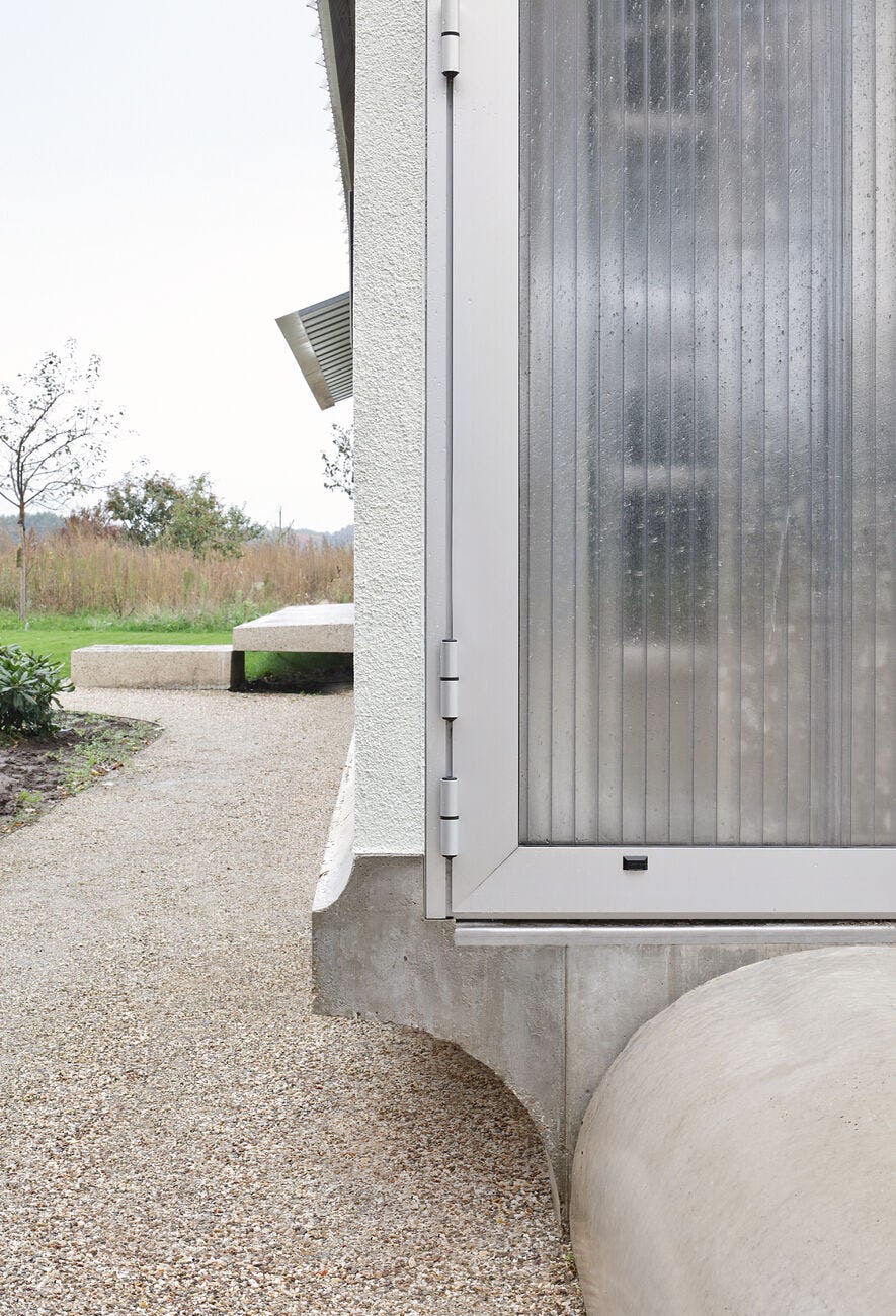 De gevel aan de straatzijde is vormgegeven als silhouet. Doorzichtige meerwandige polycarbonaatpanelen laten een glimp zien van wat zich achter de gevel bevindt. Het gebouw is opgebouwd als een houtskeletbouw op een verhoogde betonnen vloerplaat. De tuingevels zijn royaal beglaasd en de gesloten gevelvlakken zijn gestuukt.