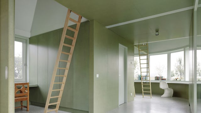 De begane grond ligt iets verhoogd en biedt een vrij uitzicht op het landschap. De woonverdieping, verbindt het interieur met de natuur en staat in contrast met de bovenverdieping. Die is nadrukkelijk introvert en wordt grotendeels verlicht door dakramen. Door het lage mansardedak lijkt het gebouw met twee verdiepingen maar één verdieping te hebben. Langs de enfilade ontstaat een ritme van smalle en brede, lage en hoge ruimtes.