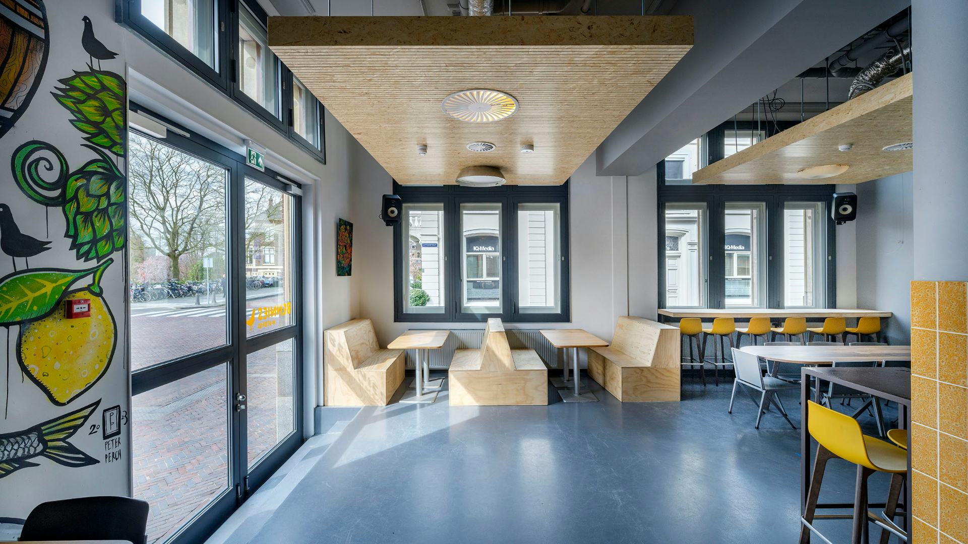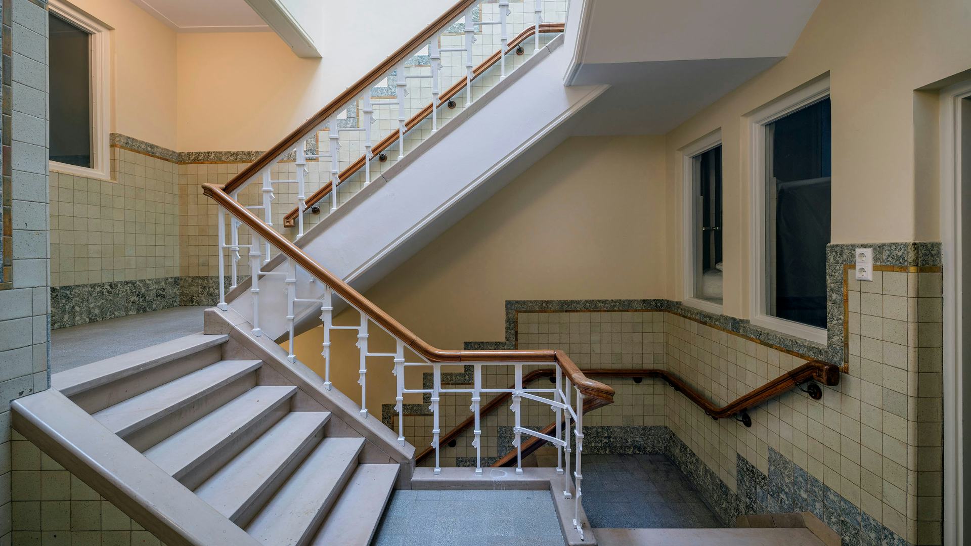 De badkamers springen er daarentegen eigenwijs tussendoor en worden benadrukt als aparte volumes door de chipwood wandbekleding. De uitstraling is basic, passend bij de naam van Hostel de Basis. De prachtige, monumentale trap met de lichtstraten erboven is behouden en verduurzaamd.