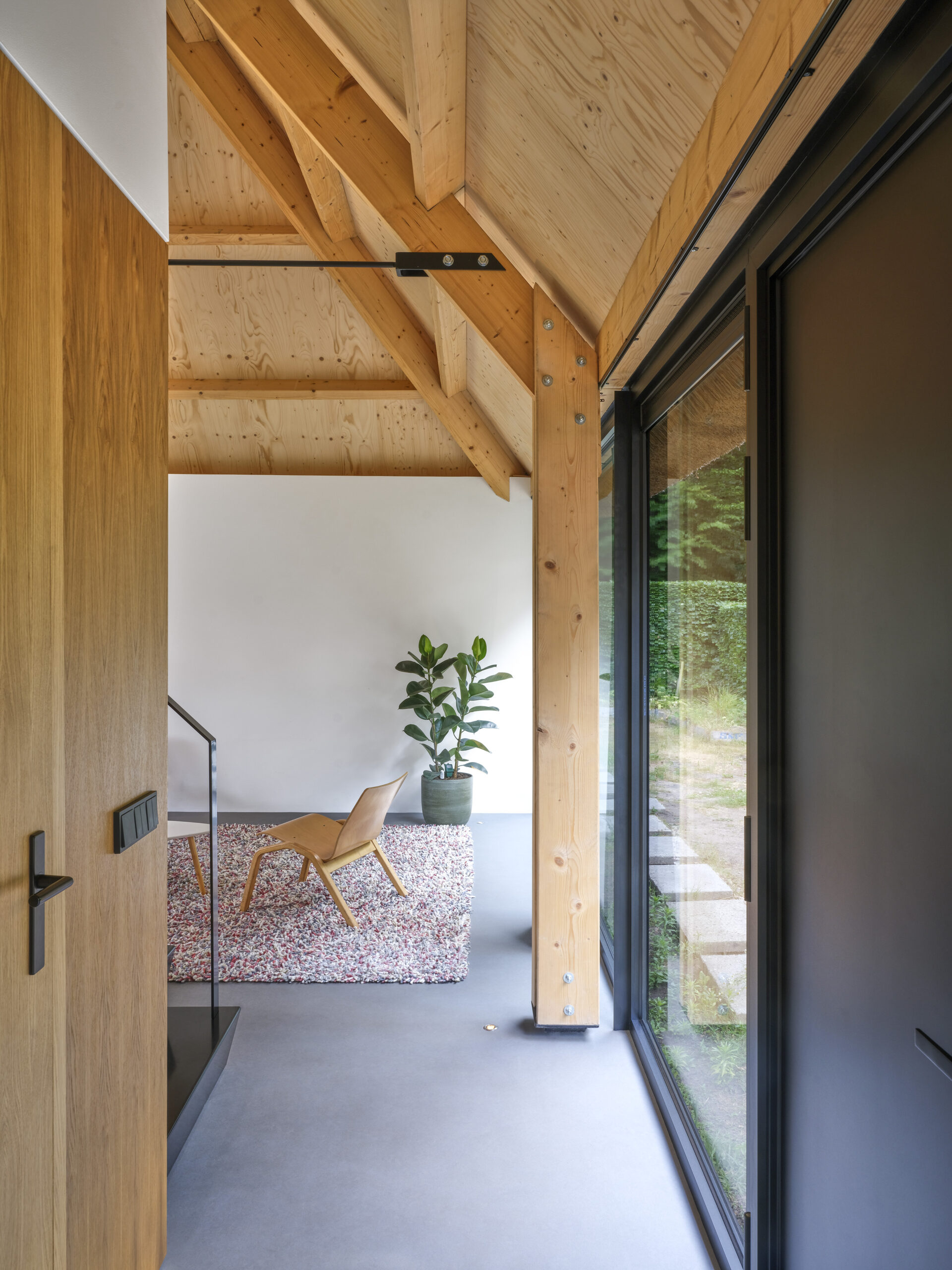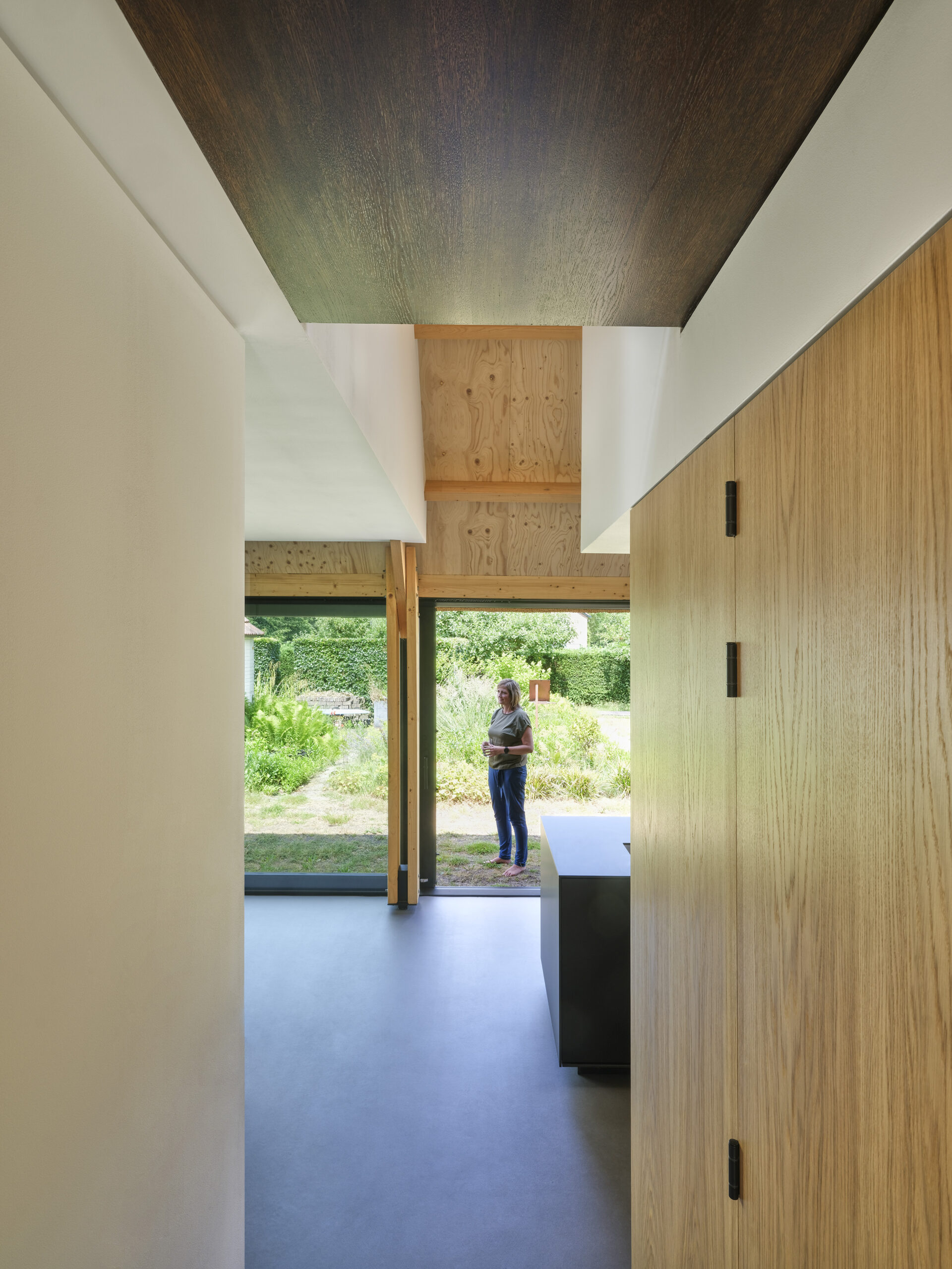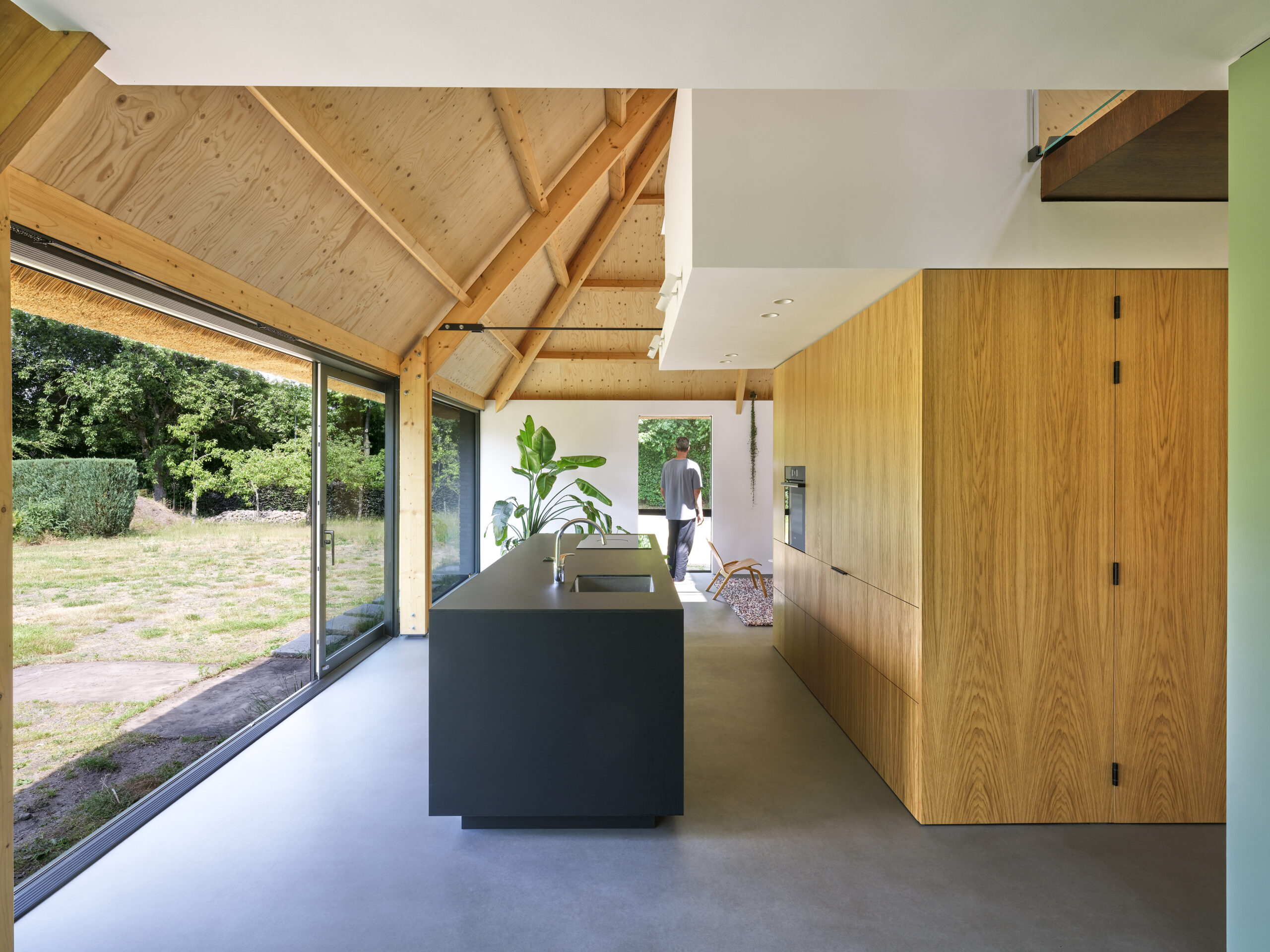 Het losse volume met uitkraging boven de keuken geeft de woonkamer maat, indeling en schaal. De grote ramen aan de noord- en zuidzijde met overstek zorgen voor een maximale beleving van de tuin, waar dieren vrij rondlopen. De straatgevel is daarentegen meer gesloten, zoals bij de oorspronkelijke boerderij het geval was.