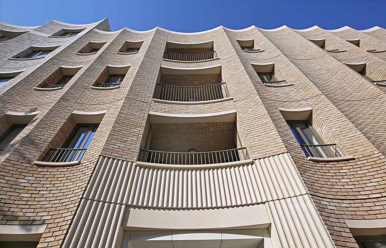 ‘De bedoeling was om het gebouw vorm te geven alsof het uit steen was gehouwen’, vertelt de architect. ‘Doorslaggevend was de keuze voor geprefabriceerde baksteenpanelen voor de hoofdgevels en traditioneel handmetselwerk voor de balkons. Op traditionele wijze hadden we dit nooit zo kunnen realiseren.’