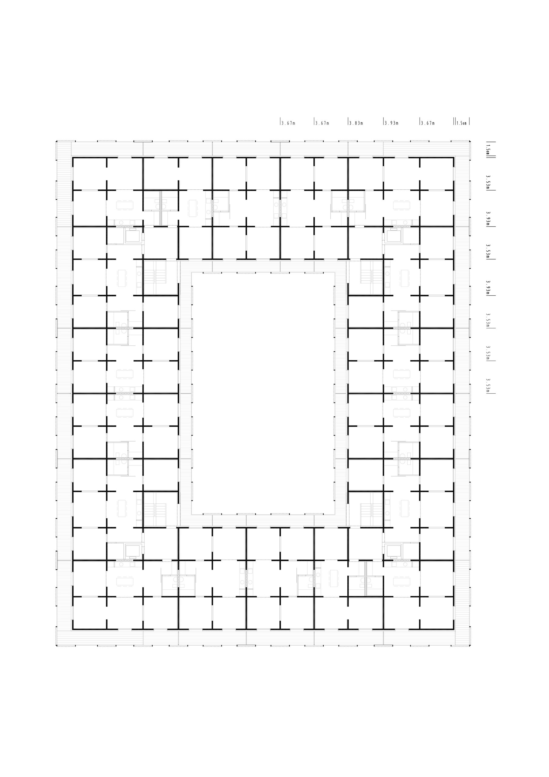 Deuren naar de individuele woningen zijn geplaatst in muren bekleed met golfplaten die een subtiel reliëf aan de oppervlakken toevoegen. Balustrades van metaalgaas langs de terrassen behouden de zichtlijnen naar de binnenplaats en de andere niveaus. De plattegrond van het rechthoekige gebouw bestaat uit een modulair grid van onderling verbonden kamers met vergelijkbare proporties. Serviceruimtes, waaronder badkamers en keukens, bevinden zich in de centrale ring, die aan weerszijden wordt geflankeerd door flexibele woonruimtes.