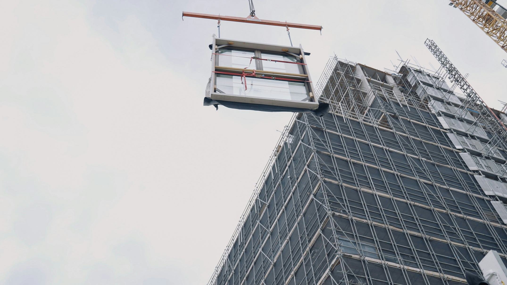 Terwijl men op de eerste woonlagen al bezig is met het plaatsen van de keukens, moeten er nog zo’n vijftien verdiepingen op de toren gebouwd worden. De productie bij Thermo Konstrukties gaat dus nog wel even door. In de fabriek worden de kozijnen al in de stelkozijnen geplaatst. De kant-en-klare elementen worden vervolgens op transport gezet naar Eindhoven. Omdat de prefab stelkozijnen te groot zij om van binnenuit of over de steiger aan te voeren, worden ze met een bouwkraan op hun plek getakeld. Het risico van takelen is wel dat de grote elementen gaan torderen of zakken. Dit kan ervoor zorgen dat bijvoorbeeld lijmverbindingen scheuren en er lekkages ontstaan. Daarom ontwierp Thermo Konstrukties eigen hijsmateriaal, specifieker: speciale hijsbeugels. Uniek in Nederland. Thissen vertelt: “Wij hijsen onder de lat van het glas. Beugels houden de platen op hun plaats. Het werkt veilig en snel.” Met deze hijstechniek zit een raam binnen een minuut op z’n plaats. “Dit wordt de nieuwe manier van bouwen”, vult Albert Derks aan met een lach.
