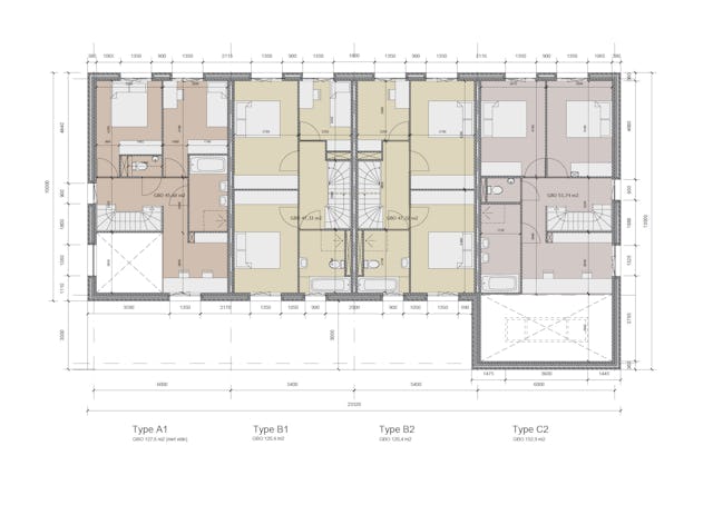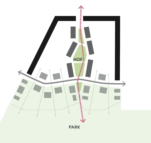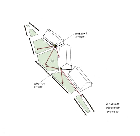 De 6 rijen van woningen zijn asymmetrisch vormgegeven en speels aan het hof geplaatst, waarbij twee rijen iets meer in het hof geschoven zijn. Op de twee plekken waar de rijen inschuiven wordt dit gemarkeerd door een overhoekse oriëntatie van de hoekwoningen middels een breed hoekraam. Door dit spel ontstaan spannende hoekverdraaiingen op ooghoogte en samenhang. Maar ook een fijne maat en schaal van het hof, die goed past bij het geborgen karakter van de woningen.