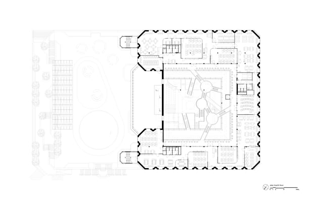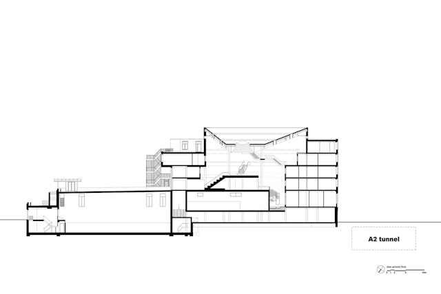 De bijzondere schoolonderdelen zijn als ‘steppingstones’ in de hoogte gespreid: het kunstencluster en de gymzaal bevinden zich op de begane grond, de ontvangstruimte, conciërge en het centrale plein op de eerste verdieping, het science cluster en de personeelsruimtes centraal op de tweede verdieping. Op de bovenste twee verdiepingen bevinden zich nog vier thuisunits.