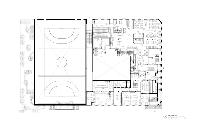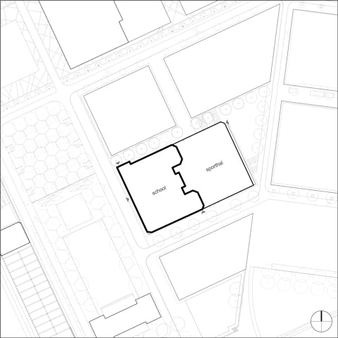 De sporthal is voor twee derde ondergronds geplaatst en biedt daardoor ruimte voor een riant verhoogd openbaar plein. Het openbare dak sluit aan op het hoofdniveau van de school. Dit openbare plein fungeert als ontmoetingsplek voor de buurt en als pauzeruimte voor de leerlingen. Het is een plein met hoogteverschillen en veel groen en daarmee een verrijking van de openbare ruimte in het stedenbouwkundig plan van Leidsche Rijn-centrum.