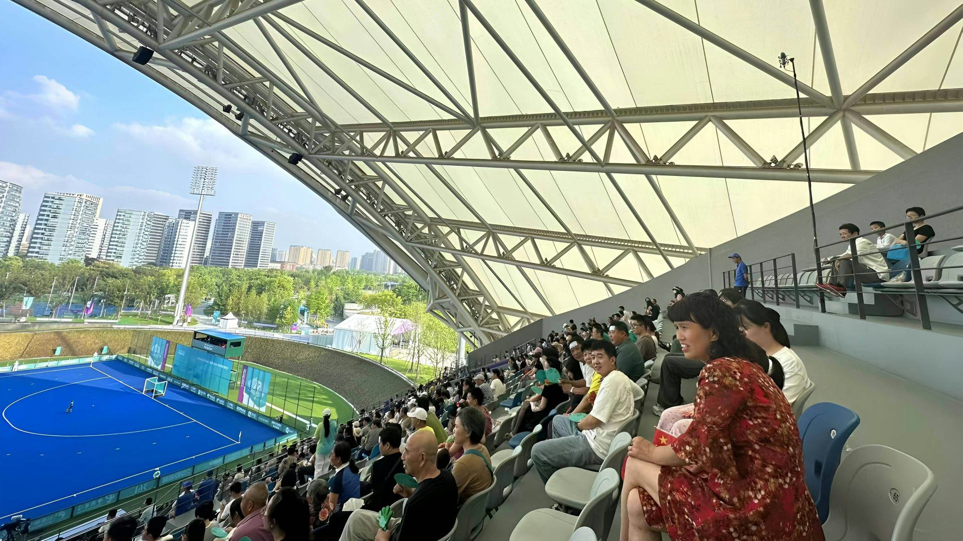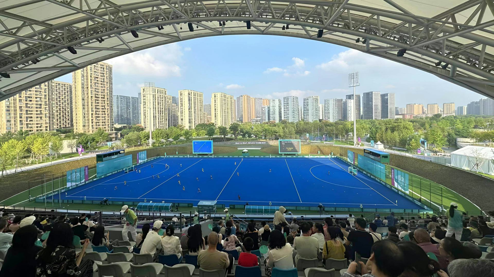 5 meter onder het terrein lijkt het Hockeystadion op te rijzen uit het geplooide landschap, zich openend naar de omgeving als een poreus en sculpturaal element in het park. Een doorschijnend vleugeldak van 125 meter overspant de lobby en tribunes, terwijl het speelveld is aangelegd in een verdiepte ovale grasvlakte. Deze grasvlakte is onderdeel van het glooiende landschap van het Hangzhou Asian Games Park, een 47 hectare groot ecopark van Archi-Tectonics met twee stadions voor de Aziatische Spelen.