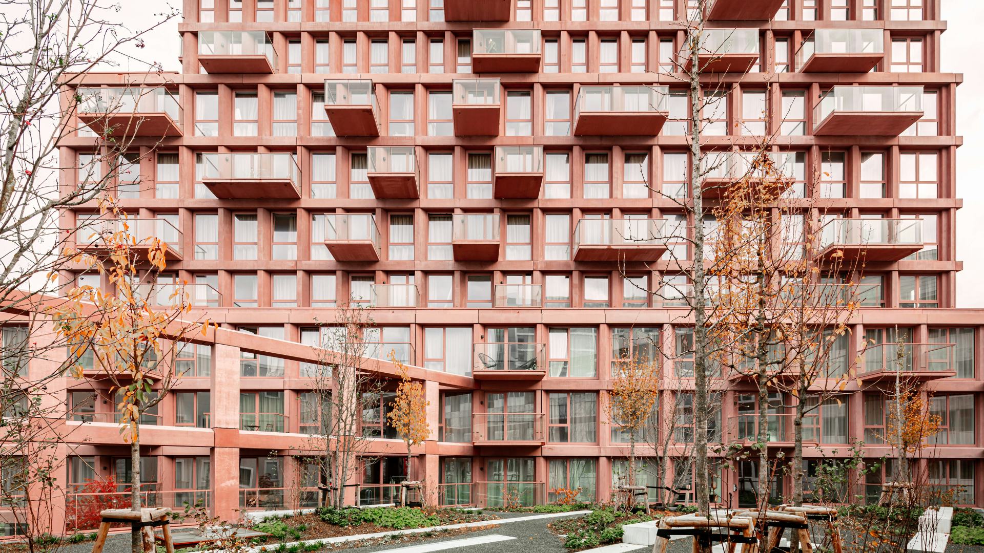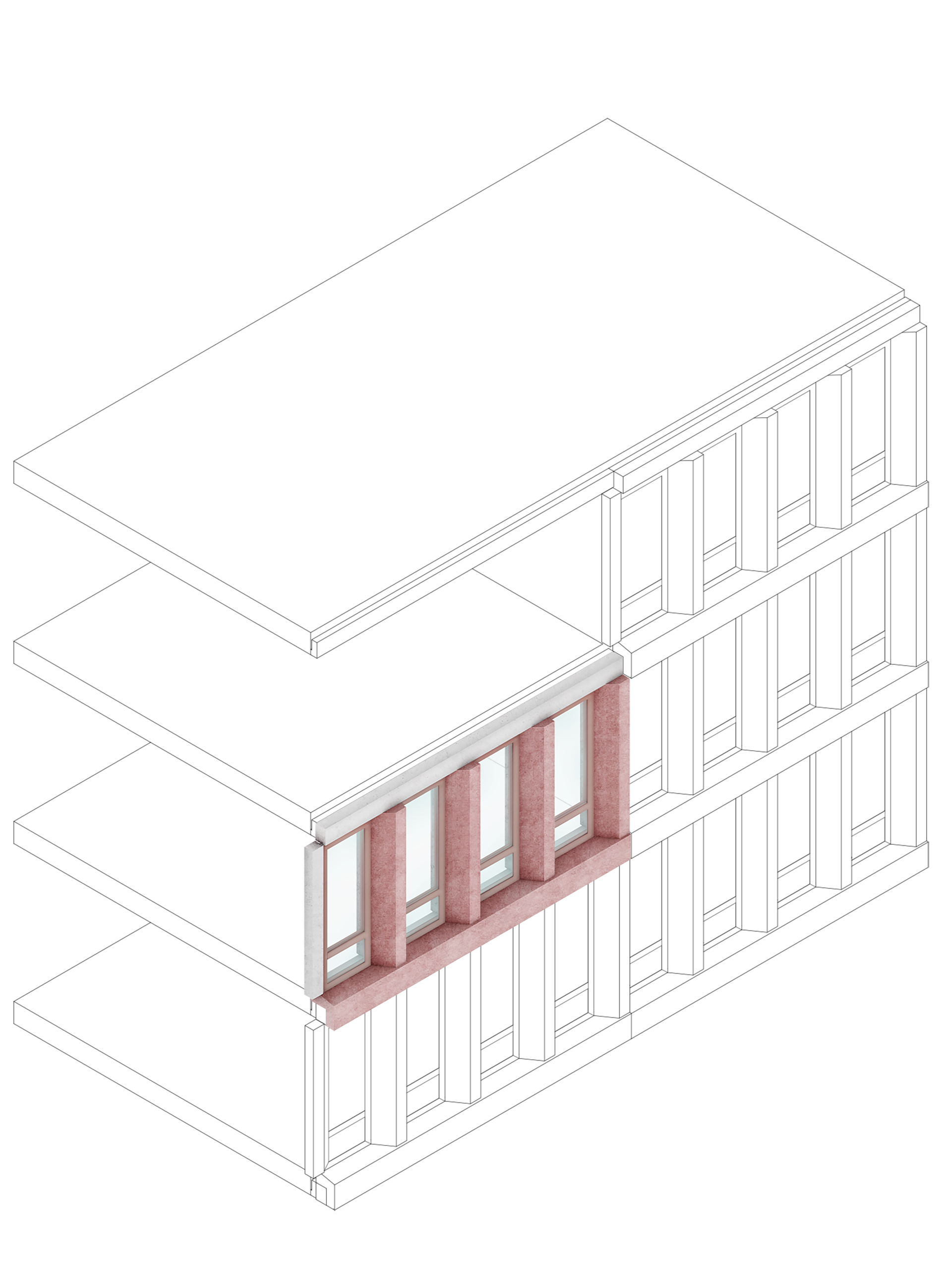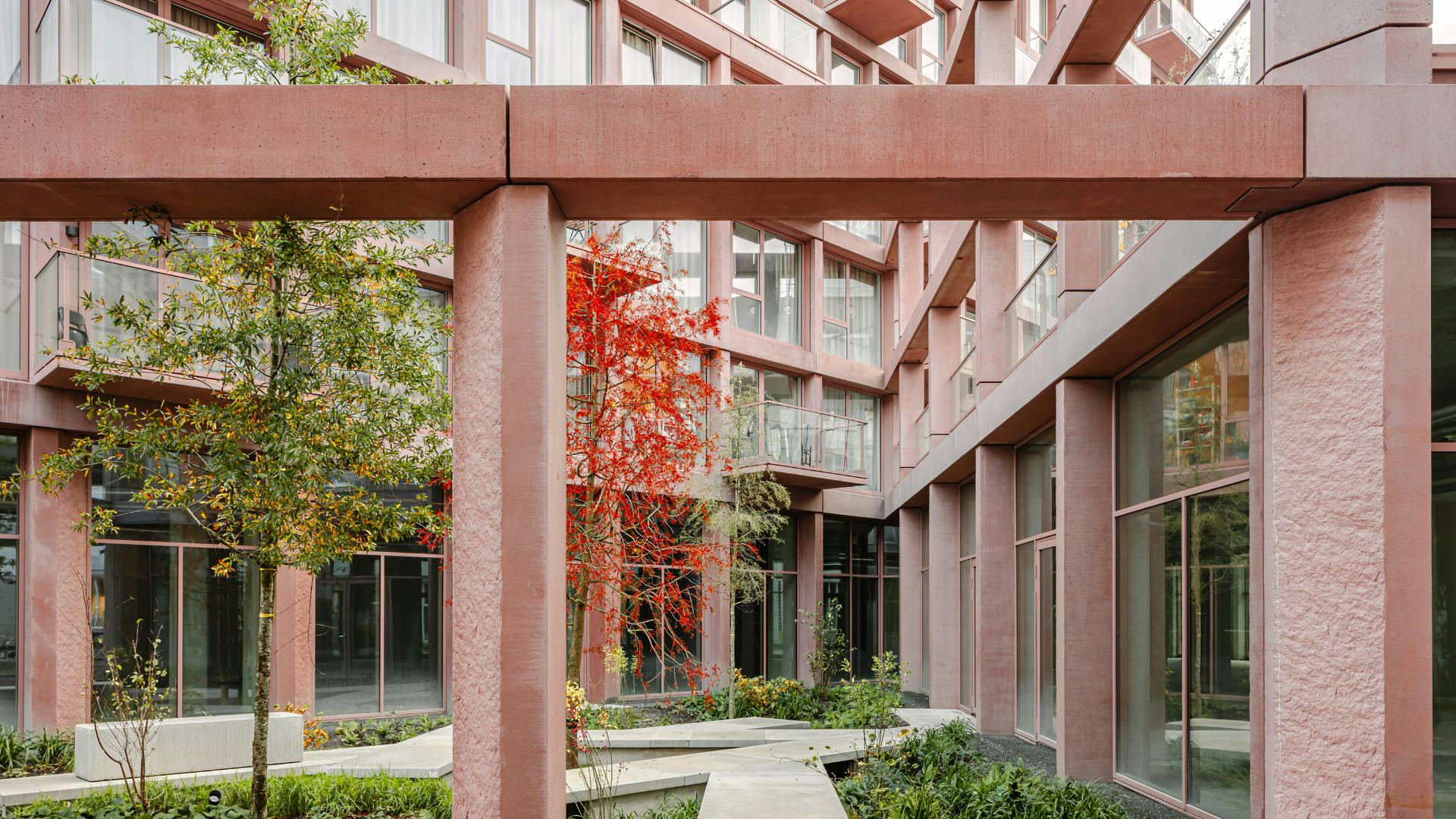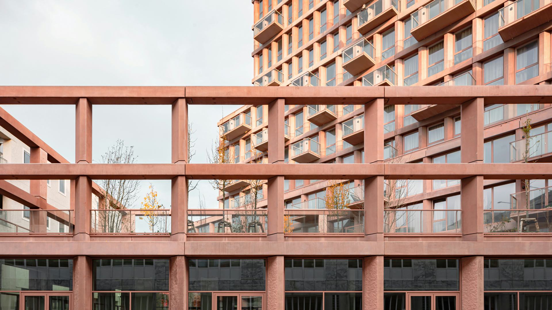 Het getrapte, leunende volume en de kenmerkende kleur maken het project tot een herkenningspunt in het stadsgezicht van Almere, met vanuit elke hoek een ander silhouette. We hebben gekozen voor een monochromatische, zachtrode betonnen gevel die gedurende de dag van kleur lijkt te veranderen en het rechtlijnige grid verzacht. Elk volume heeft zijn eigen gevelritme, wat de gestapelde configuratie van het gebouw versterkt.