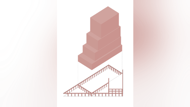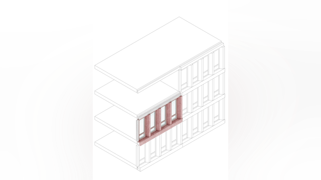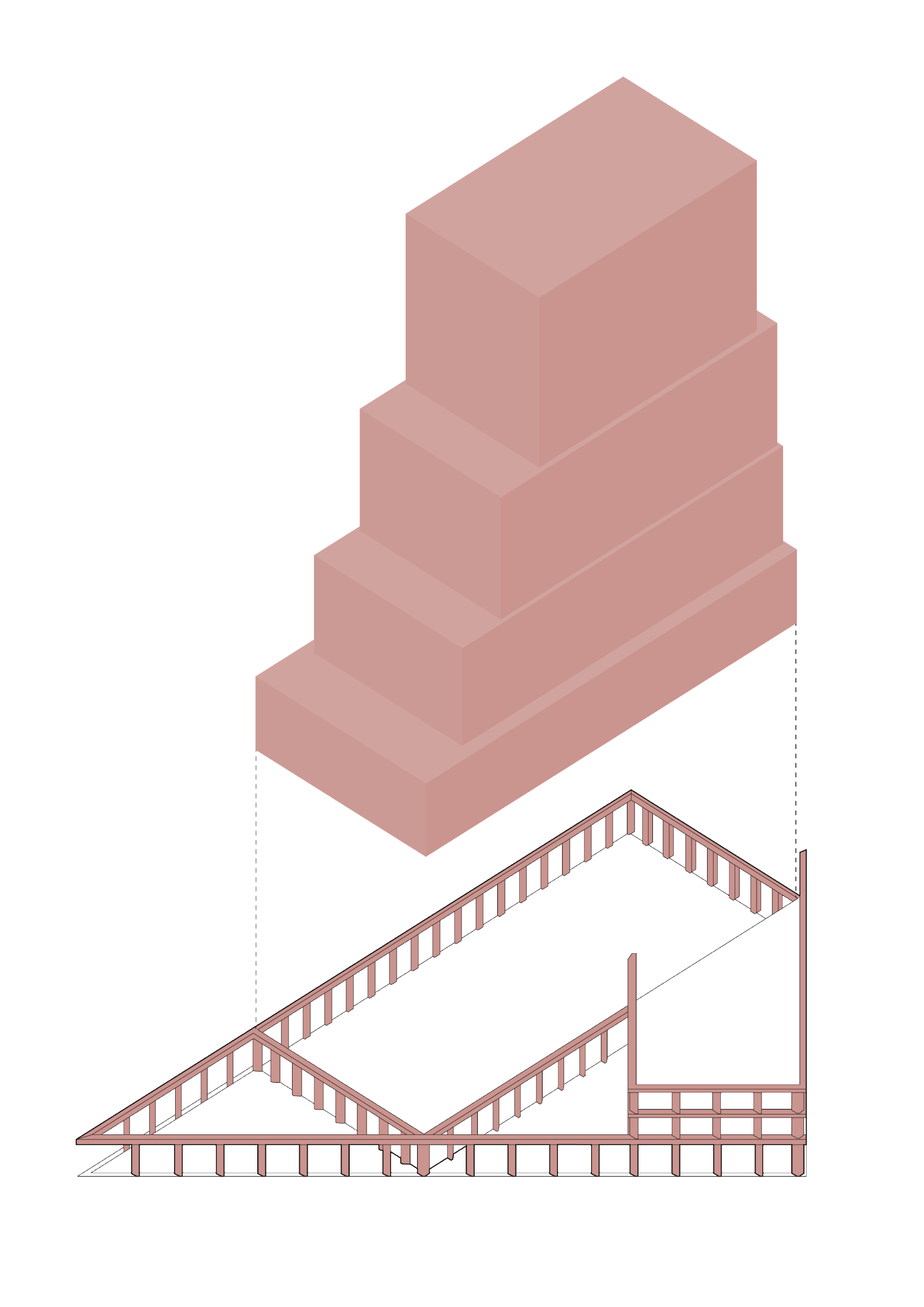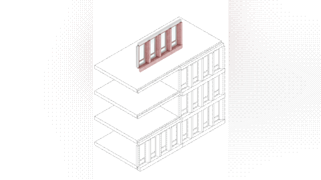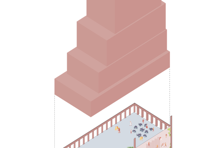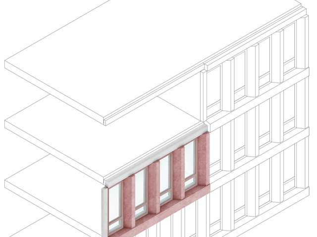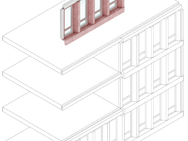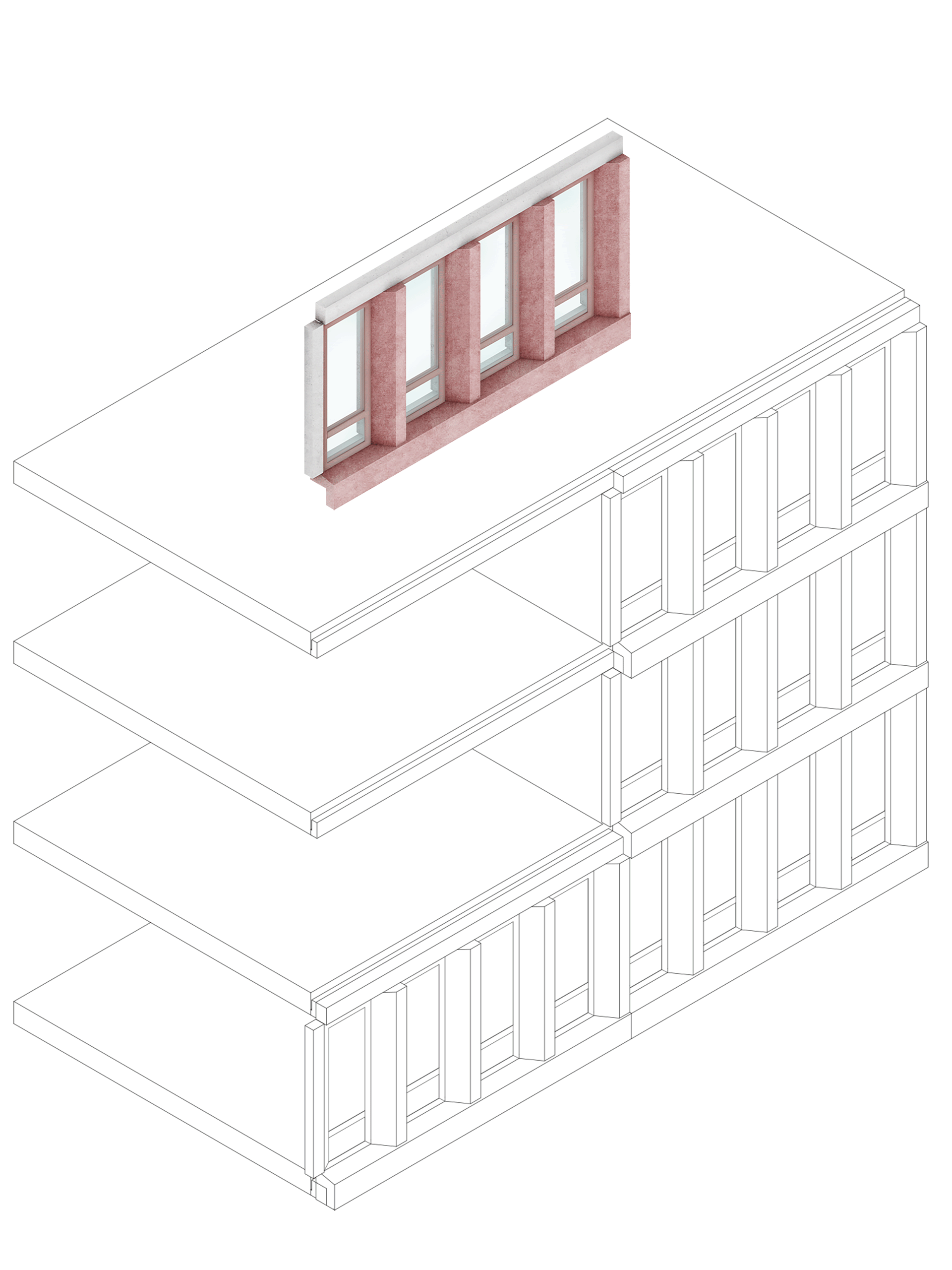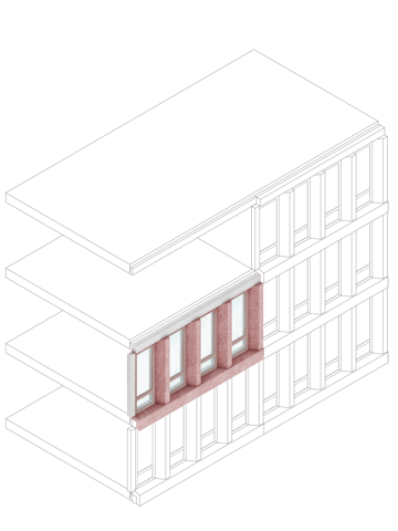 Het getrapte, leunende volume en de kenmerkende kleur maken het project tot een herkenningspunt in het stadsgezicht van Almere, met vanuit elke hoek een ander silhouette. We hebben gekozen voor een monochromatische, zachtrode betonnen gevel die gedurende de dag van kleur lijkt te veranderen en het rechtlijnige grid verzacht. Elk volume heeft zijn eigen gevelritme, wat de gestapelde configuratie van het gebouw versterkt.