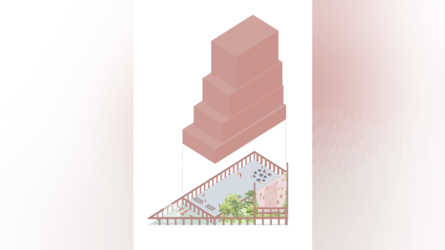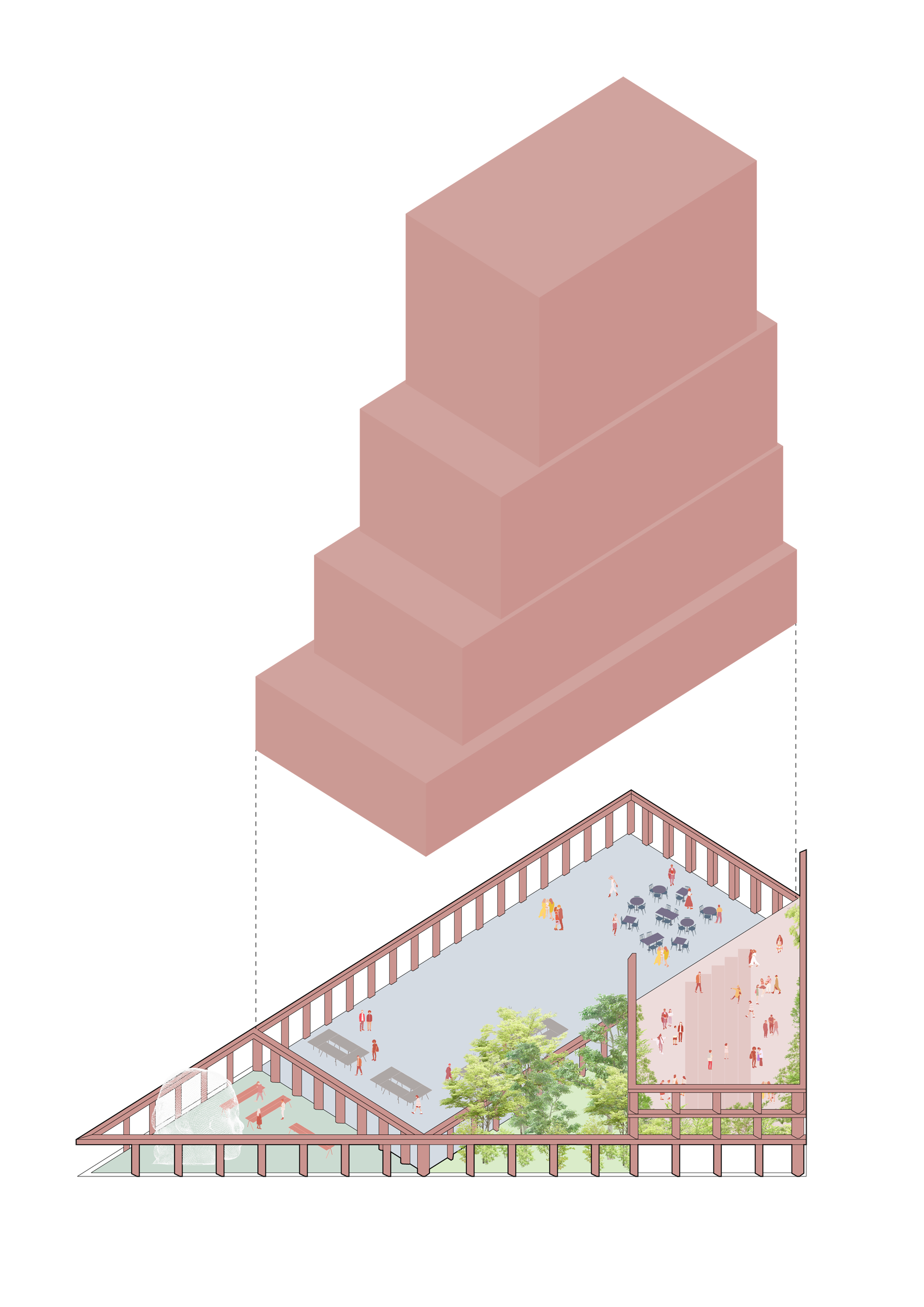 In het ontwerp bedachten de architecten een uniek element: een driehoekige plint die volledig bestaat uit 'stadskamers'. Het zijn intieme, stedelijke binnen-en buitenruimtes die vloeiend in elkaar overgaan en je verleiden er doorheen te dwalen. Elke stadskamer wekt een eigen gevoel van verwondering op, maar laat het gebruik altijd aan je verbeelding over.