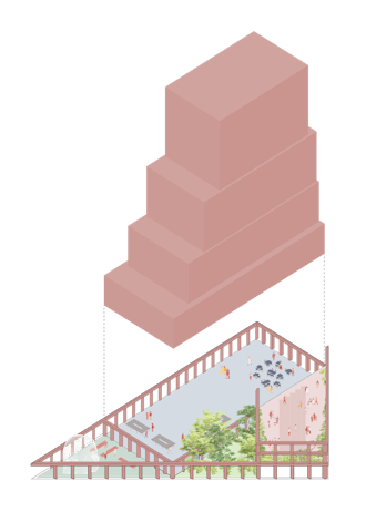 Tot nog maar kort geleden was er een stenige en anonieme restruimte, braakliggend langs een van de stadsassen naar het hart van Almere. De gemeente had de ambitie om de locatie te herbestemmen tot een van deze nieuwe stedelijke plekken, waar goed wonen voor een brede groep starters samenkomt met gezonde verblijfsruimtes en onverwachte functies die voor nieuwe levendigheid in de publieke ruimte zorgen. De compacte, driehoekige vorm van de kavel bracht extra uitdagingen met zich mee voor deze wens.