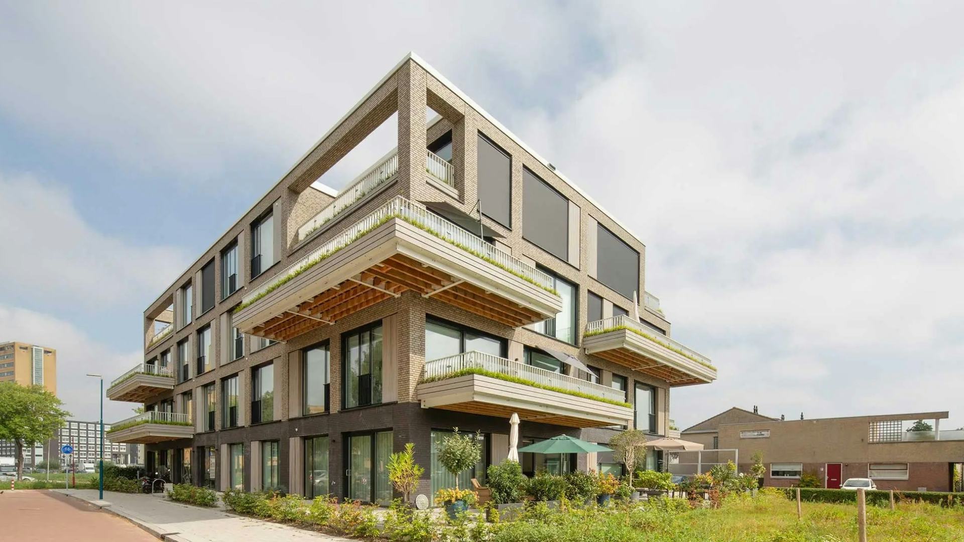 De eerste bouwlaag is gematerialiseerd in een zwart/grijze baksteen en de drie bouwlagen daarboven in een groen/grijze baksteen. Hierdoor krijgt het gebouw een duidelijke plint en lijkt de bovenbouw als het ware te ‘zweven’ ten opzichte van de donkere ondergelegen plint. Naast baksteen is vergrijsd hout als materiaal voor de gevels gekozen. Dit hout wordt verticaal toegepast in de dichte gevelpanelen en horizontaal in de plantenbakken, waardoor een lijnenspel ontstaat tussen de dichte gevelpanelen en de plantenbakken.