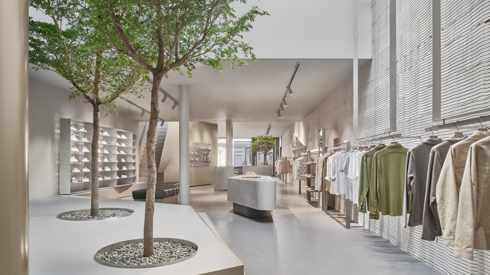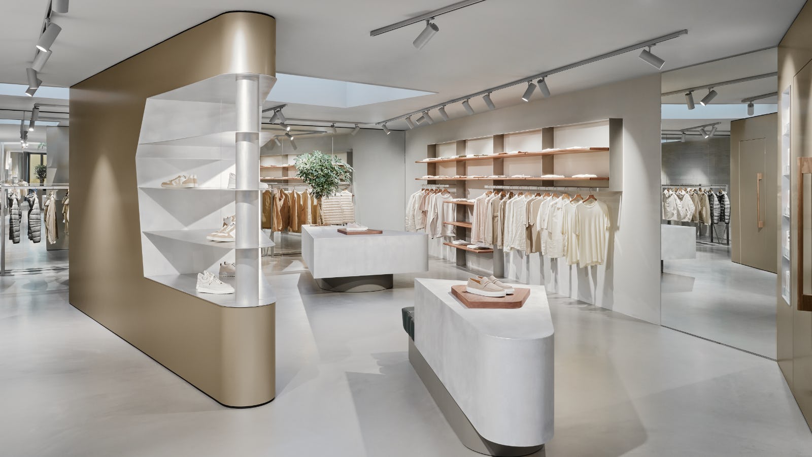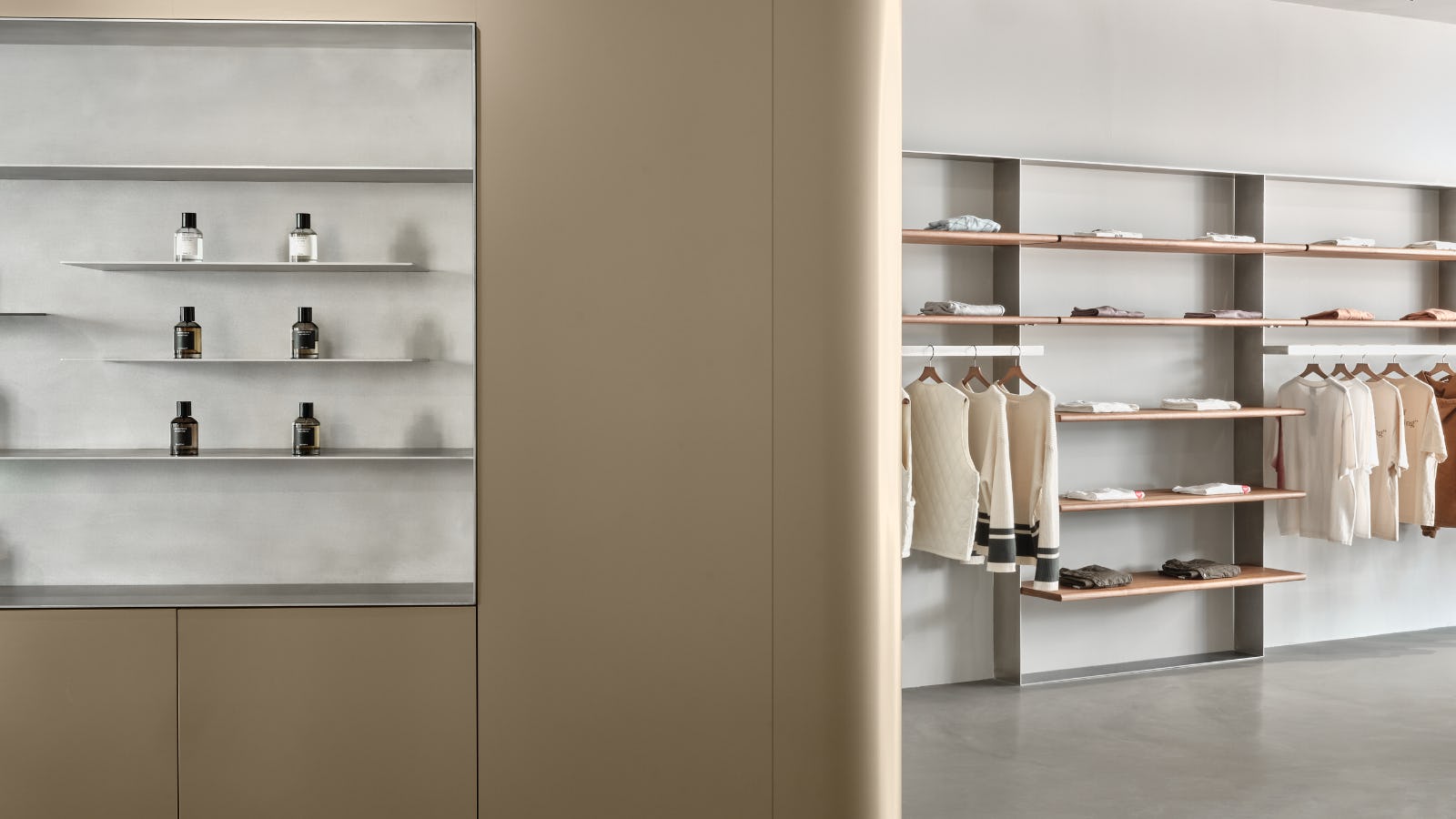 Langs de zijkant van de ruimte staan de harde metalen en geaccentueerde hoeken van de rekken en nissen in contrast met de ruwe cementafwerking van de muren. De horizontale oriëntatie van het cementwerk zorgt voor een mooi spel met het zonlicht dat door de dakramen naar binnen valt. Het kleurenpalet van de winkel is uitgevoerd in meerdere grijstinten en de geanodiseerde aluminium volumes hebben een champagne-achtige afwerking. Details zoals planken en deurgrepen zijn van geolied walnoot. De andere metalen oppervlakken veranderen van kleur afhankelijk van de omstandigheden eromheen. Bomen in vloer en tafels werden toegevoegd aan het zachte kleurenprogramma; allemaal ter ondersteuning van de ingetogen en hoogwaardige collecties in de winkel. De kwaliteit van de ervaring zit hem eerder in de zachte mannelijke kwaliteit van de materialen, het materiële contrast en ruimtelijke kwaliteiten als stroming, vorm, volgorde en licht.